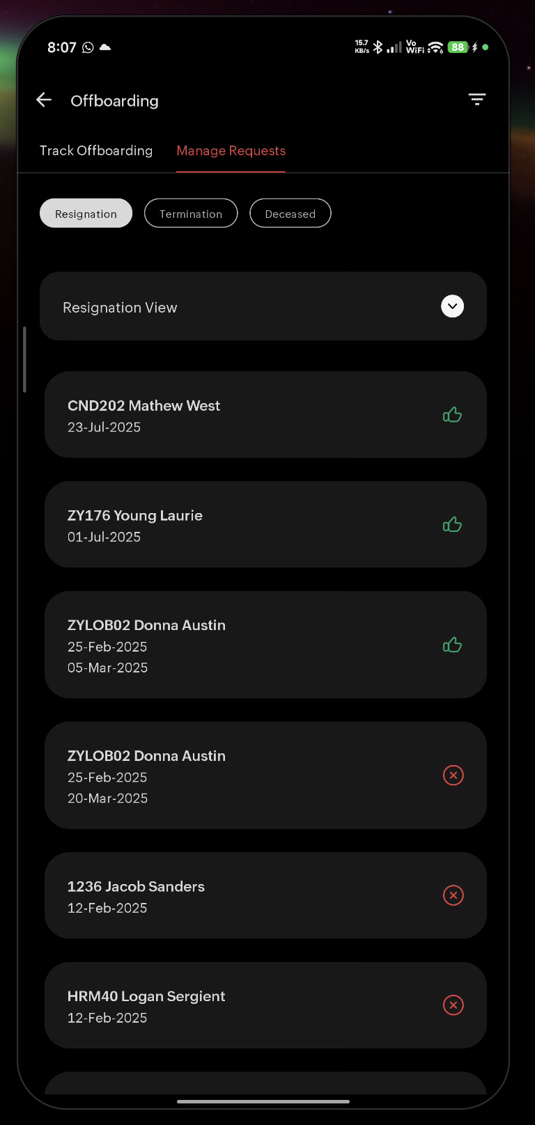 View and manage resignation, termination, and deceased employee requests.