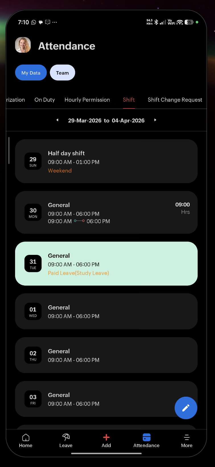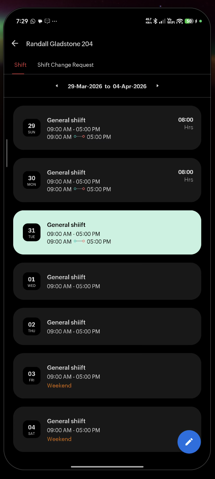 From the Attendance > Shift tab, tap the Circle Edit (pencil) icon: