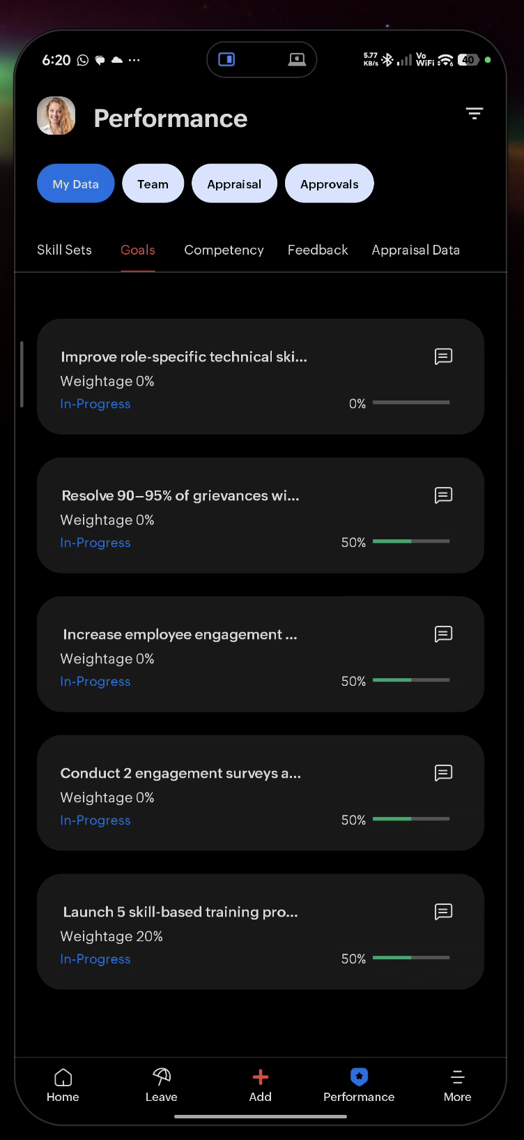 Add and manage Goals, Competencies, Skill Sets, KRAs for specific employees. Share feedback directly to an employee.