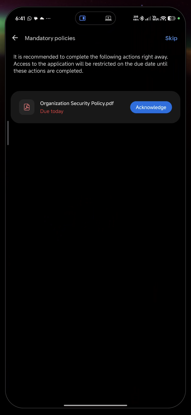 - If your organization requires camera verification, the front camera will activate for a photo.