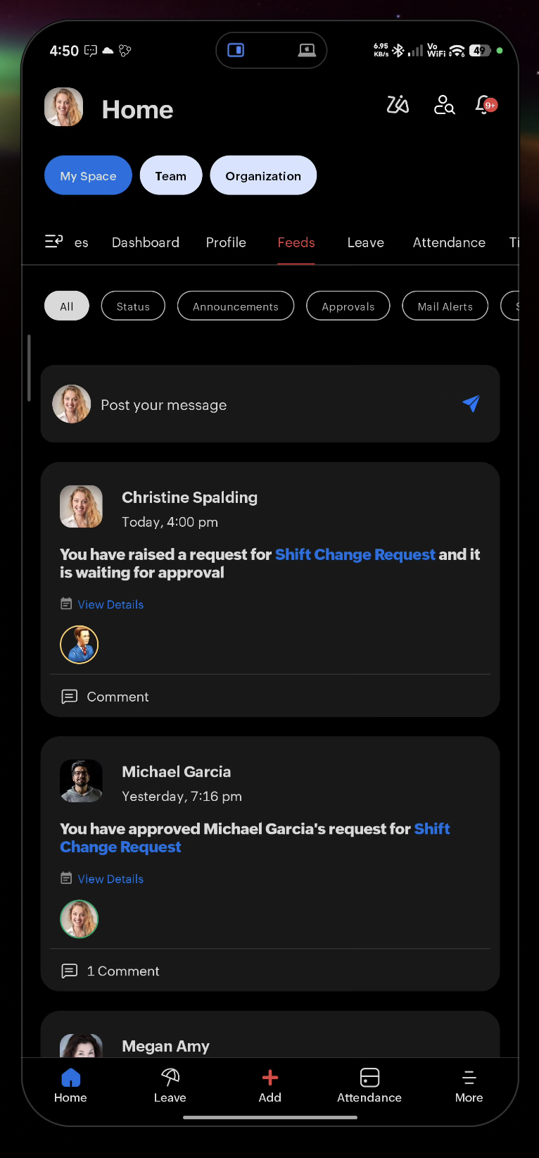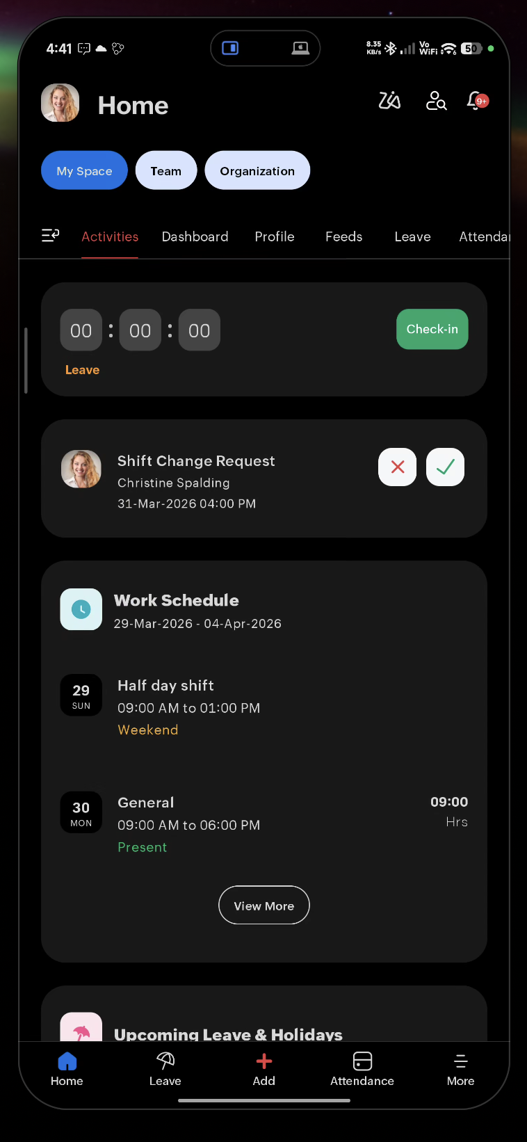 The Home Screen in the Zoho People mobile app features three 'Spaces'. Namely: My Space, Team Space, and Organization Space. The Spaces will be covered in detail later in the document. Users can navigate between the three 'Spaces' using the corresponding buttons and swipe between the sub-tabs.