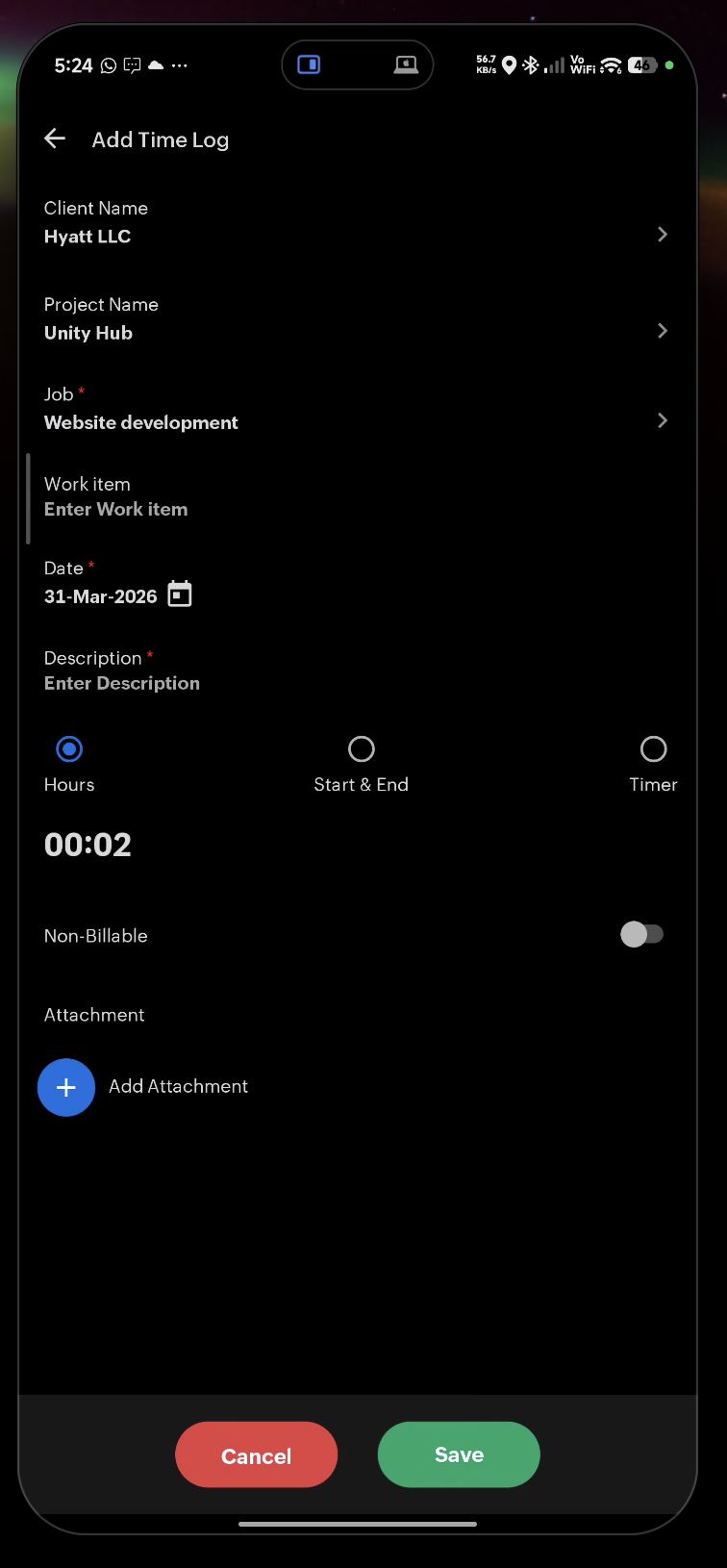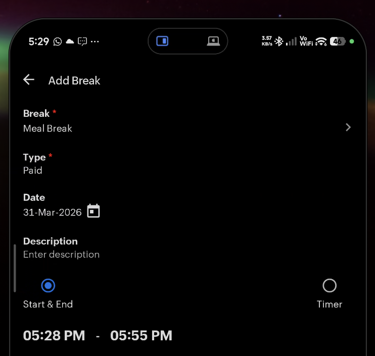Use this when you are working outside the office (field work, client visits, etc.).