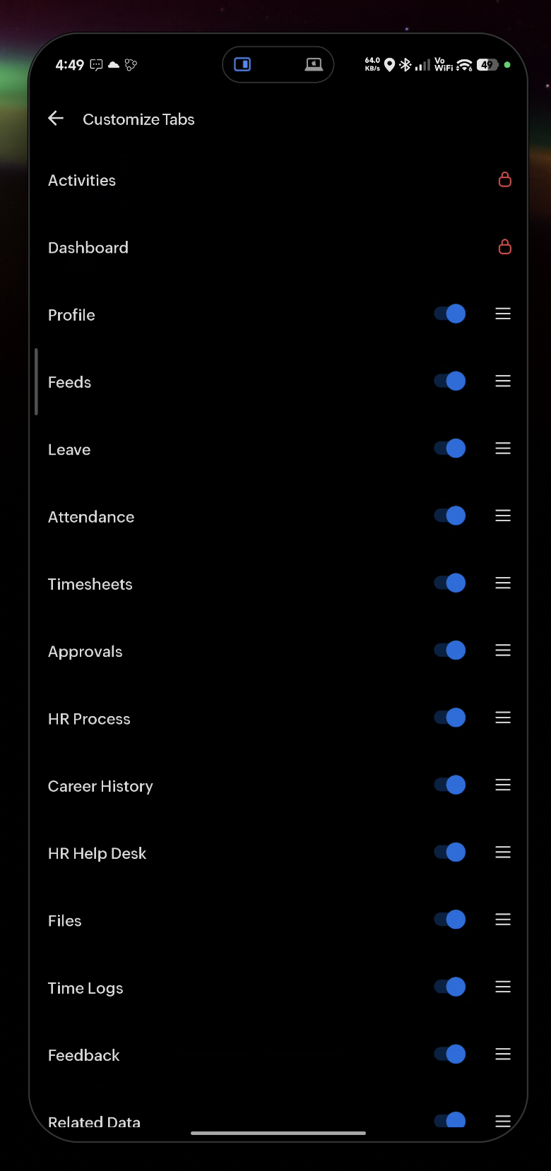 Tabs listed within My Space can be enabled/disabled/rearranged