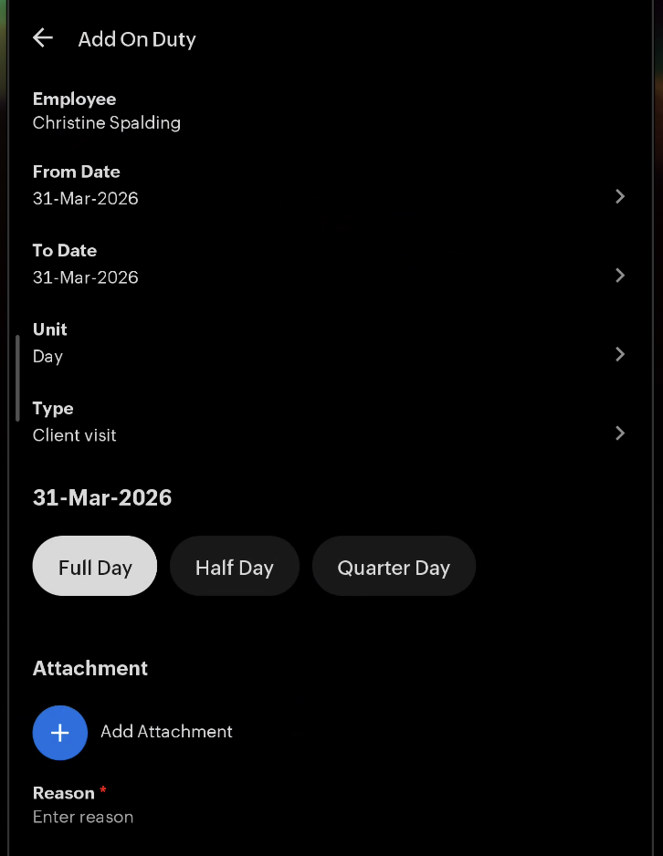 From the Attendance section, select On Duty and tap Add:
