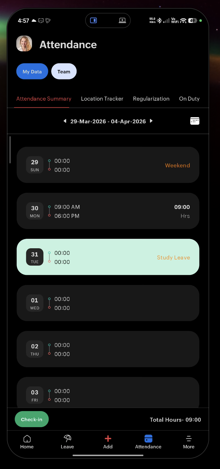 - Each entry shows check-in time, check-out time, total work hours, and status.