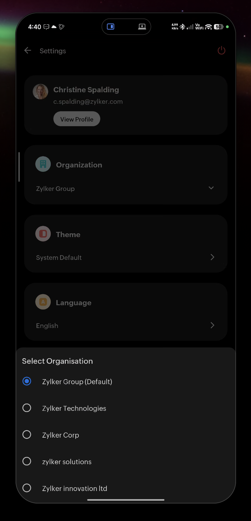 If you belong to more than one organization, you can switch between them from More > Settings (Gear icon) > Organization at any time.