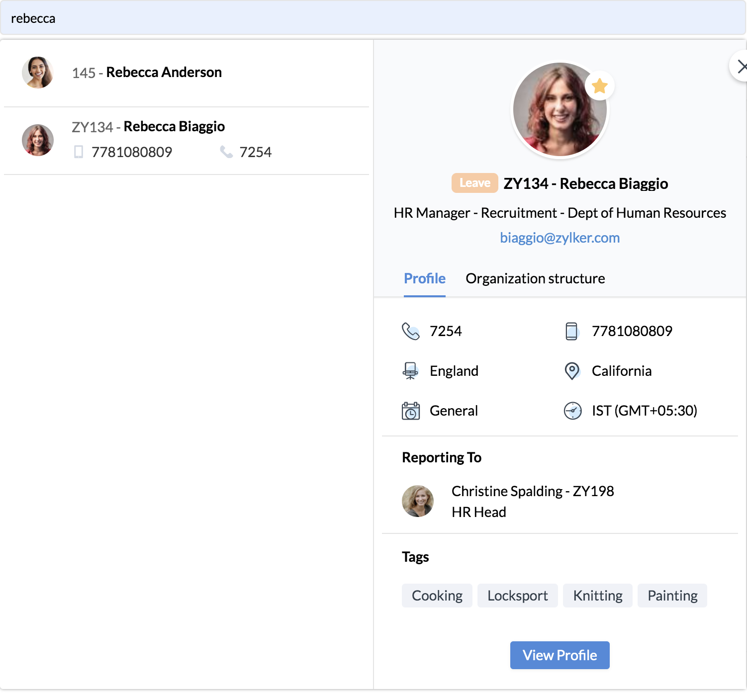 The employee global search feature allows an employee to quickly look up the information of any employee in the organization.