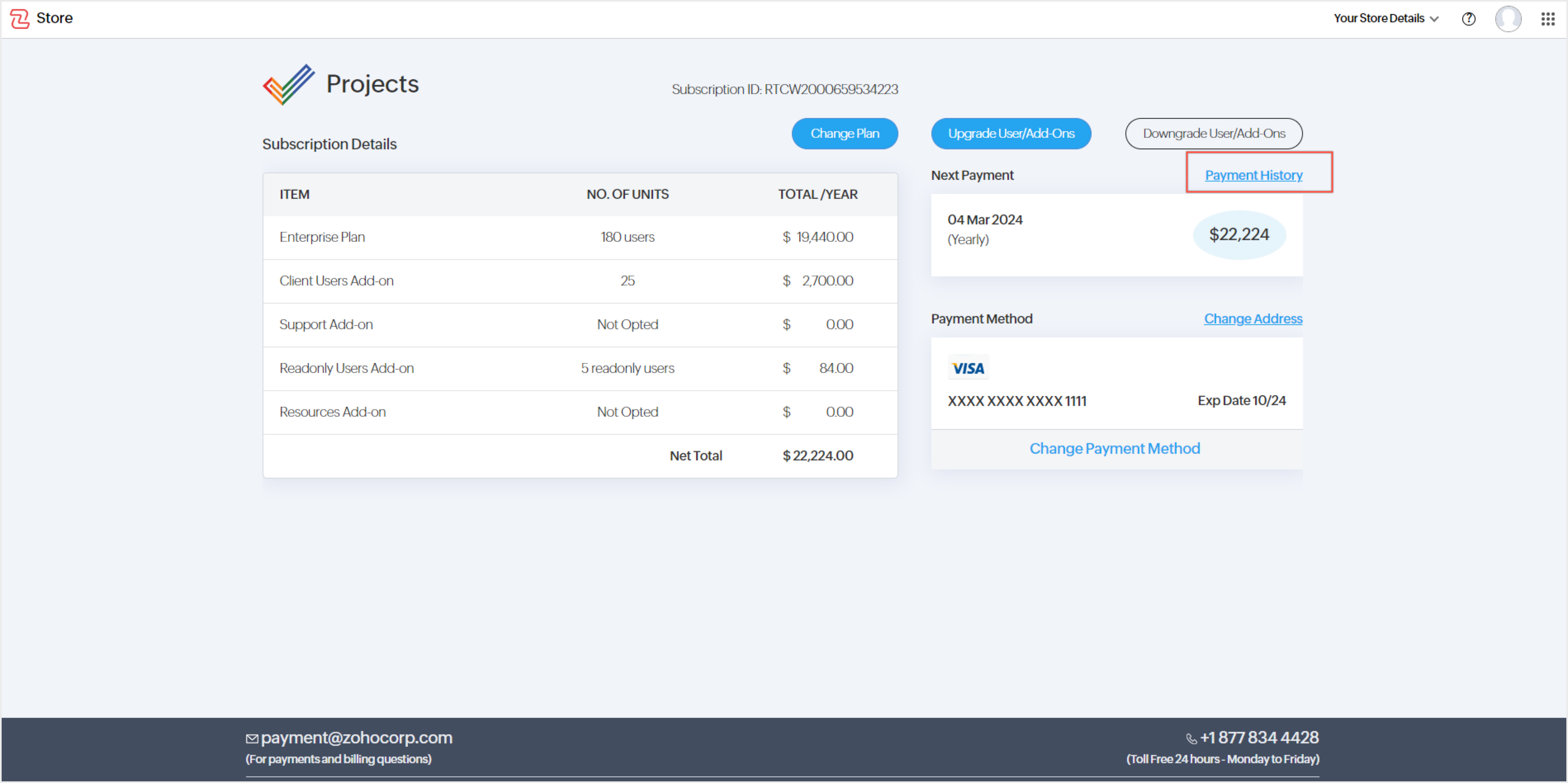 Download your payment invoice and keep it for reference. You can view the payment history and also download past invoices from Zoho Projects.