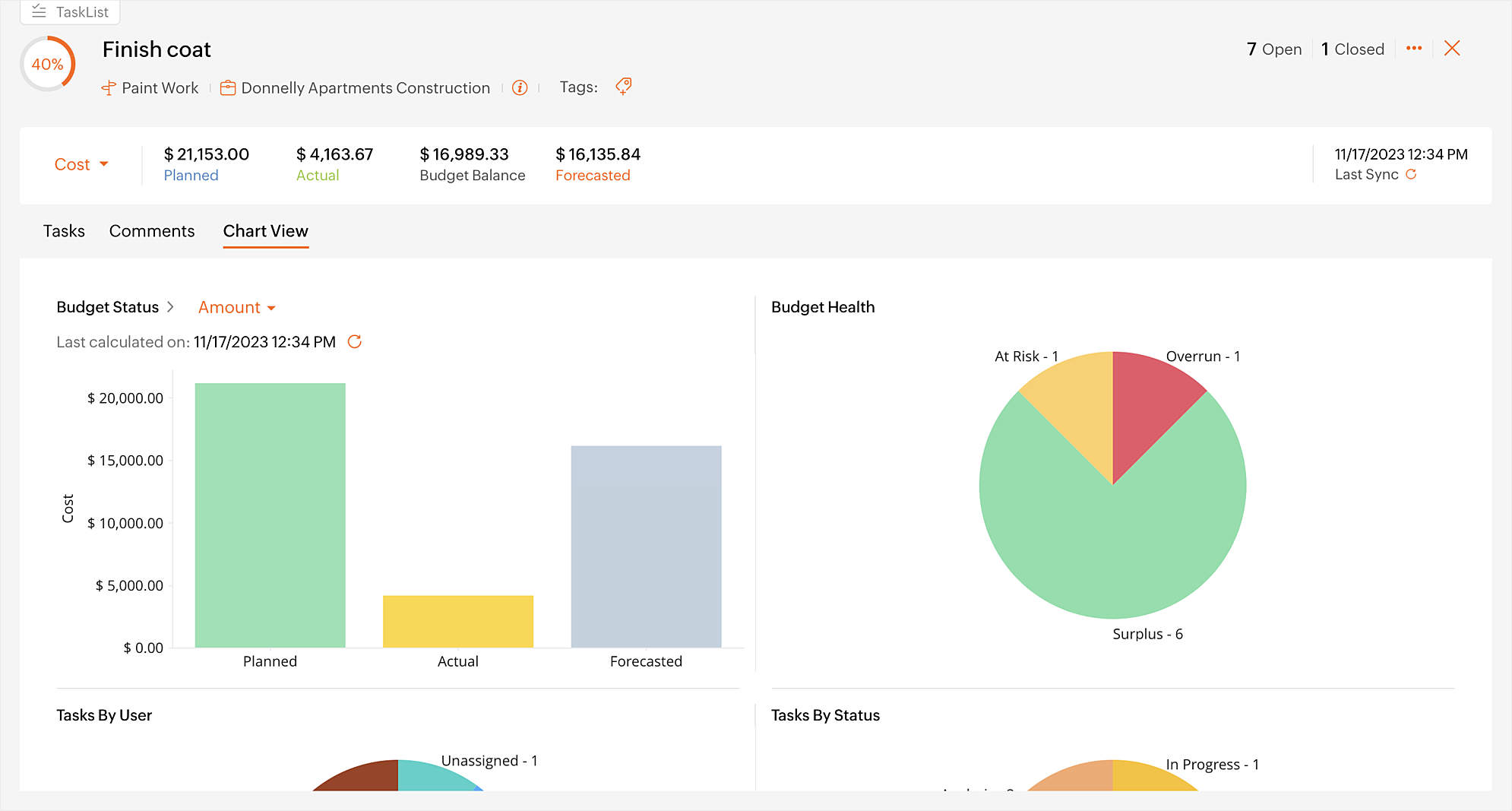 2. Budget status: View the count of at-risk, budget overrun, and budget surplus tasks.