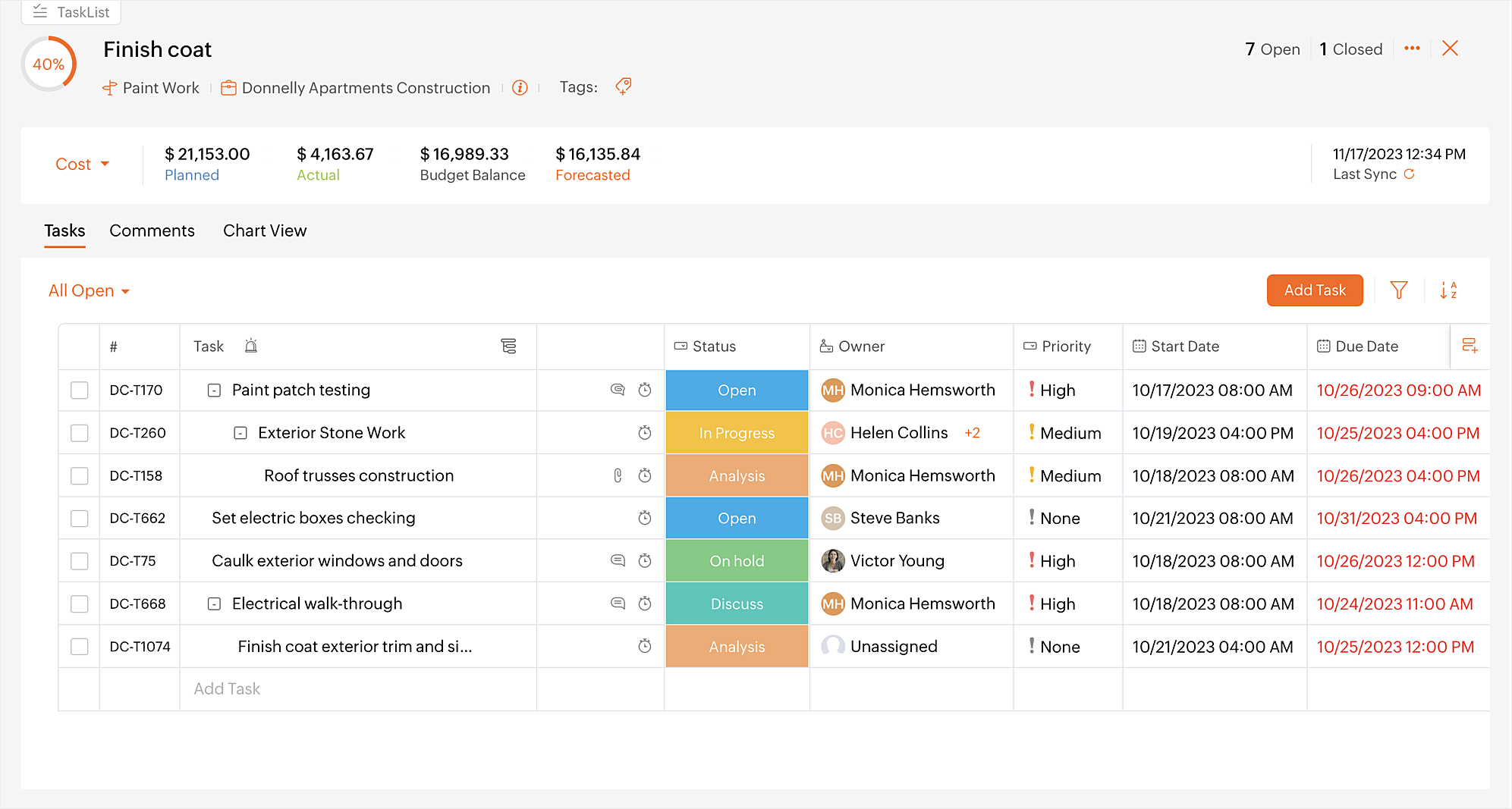 View the planned versus actual cost and cost variance details in the list and detailed view of a task list. You can only view this if budget is enabled in the setup page. If your project is based on hours, then the Difference column will show the difference between planned and actual hours. If it is based on the amount, then the Cost Variance column will highlight the difference in planned and actual cost. Learn more about creating a budget.