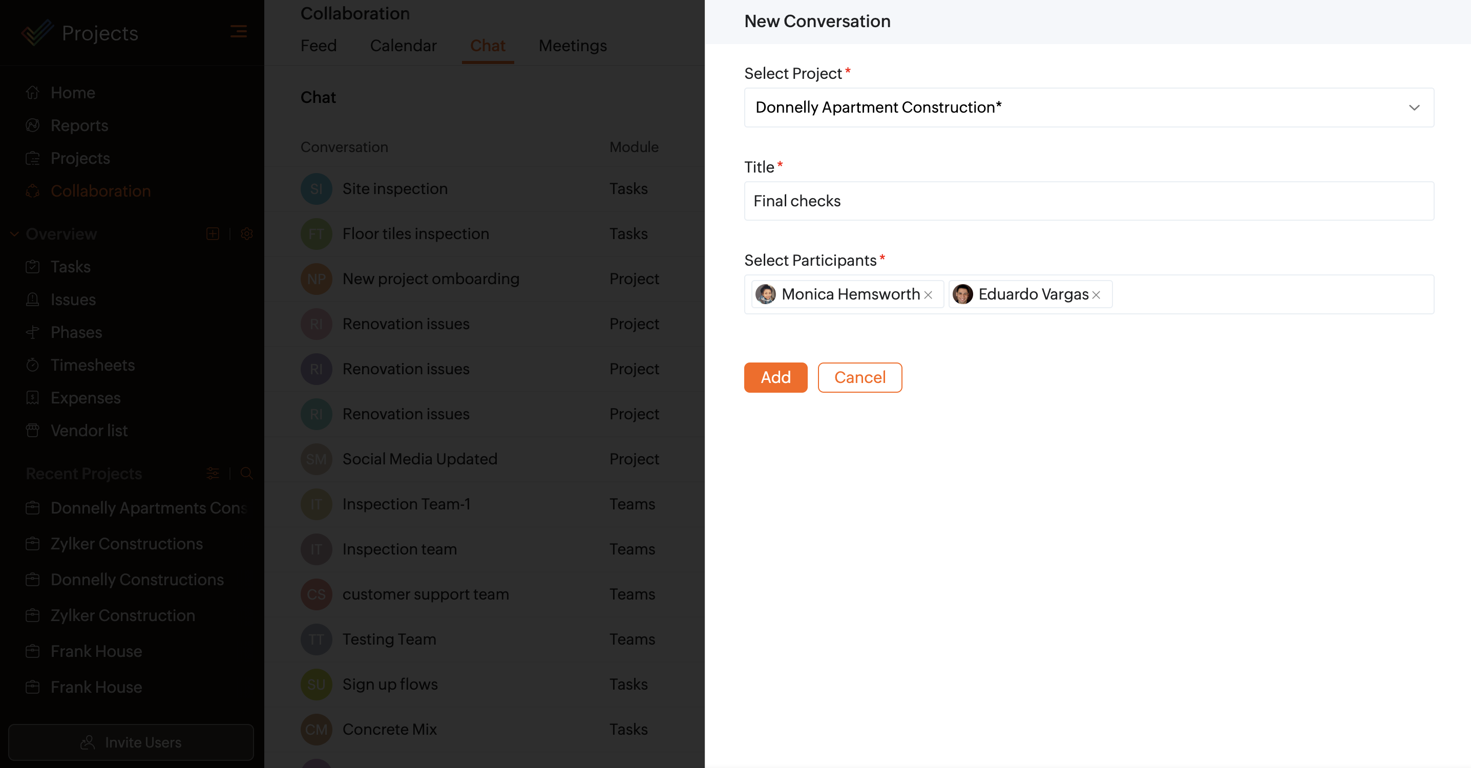 Zoho Projects lets you engage with portal users anytime to keep the discussion going. This can be done via chat channels or via A/V meetings.