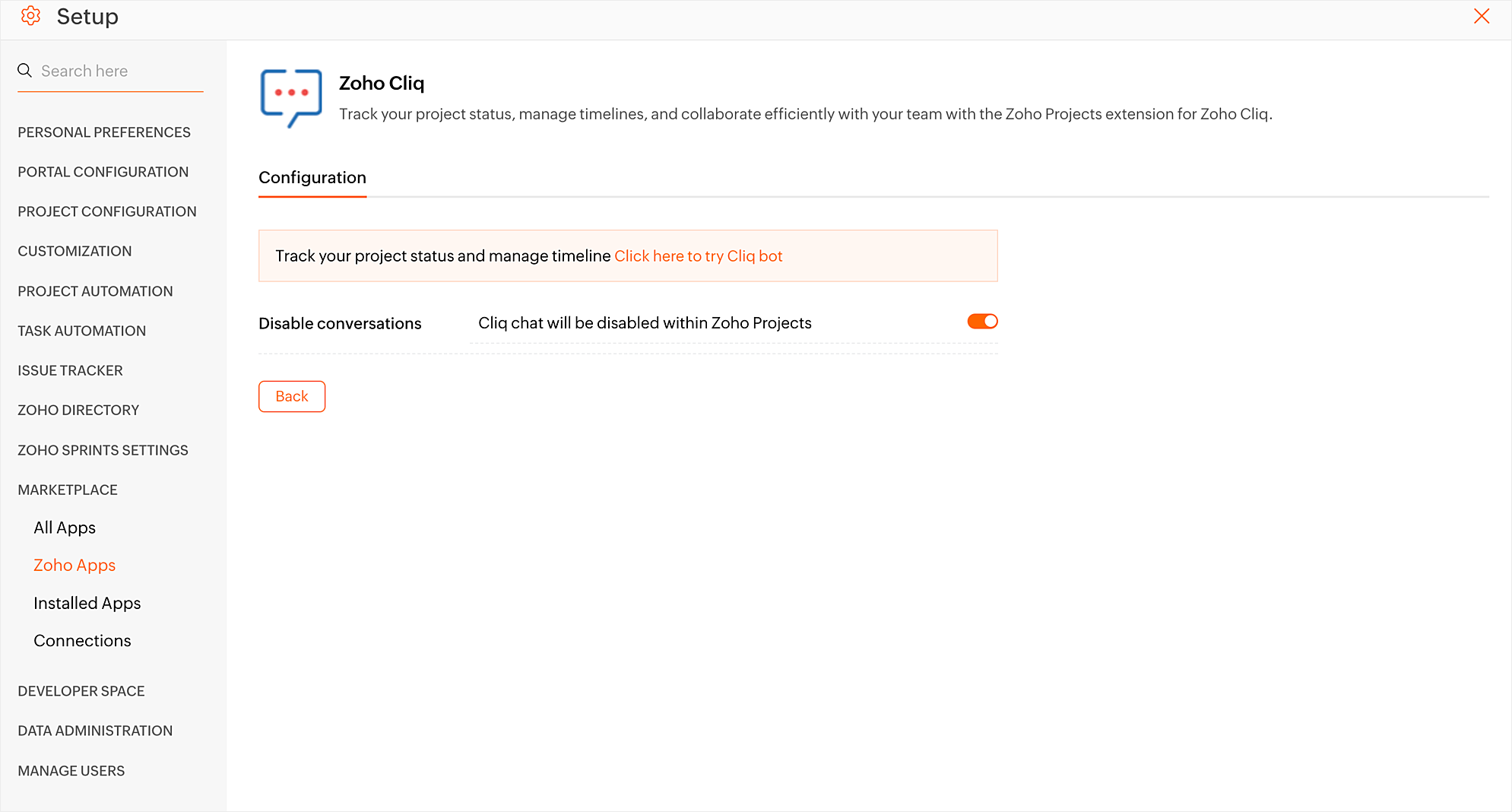 1. Navigate to > Marketplace > Zoho Apps > Zoho Cliq.