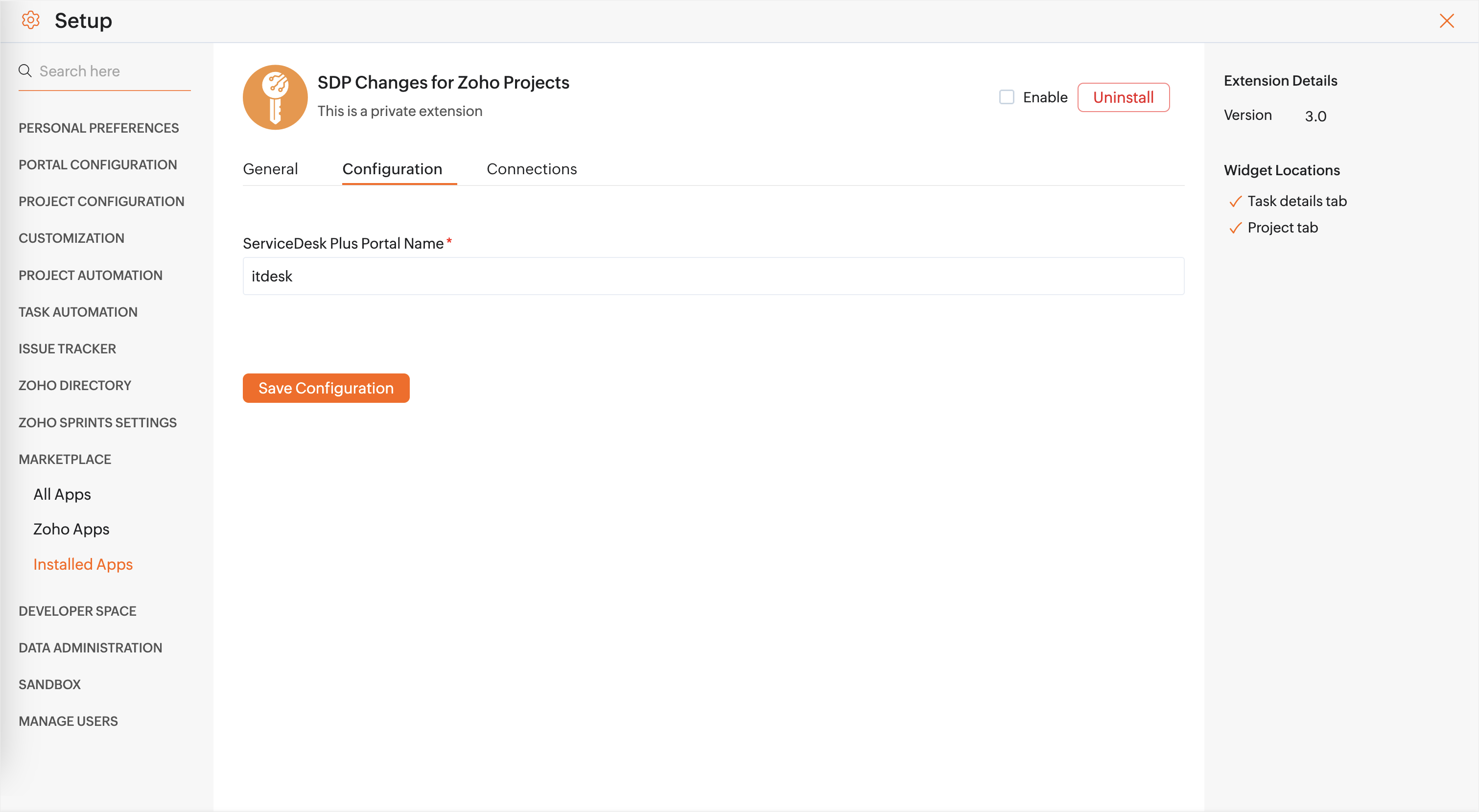 3. Click SDP Changes for Zoho Projects, then click Configuration.