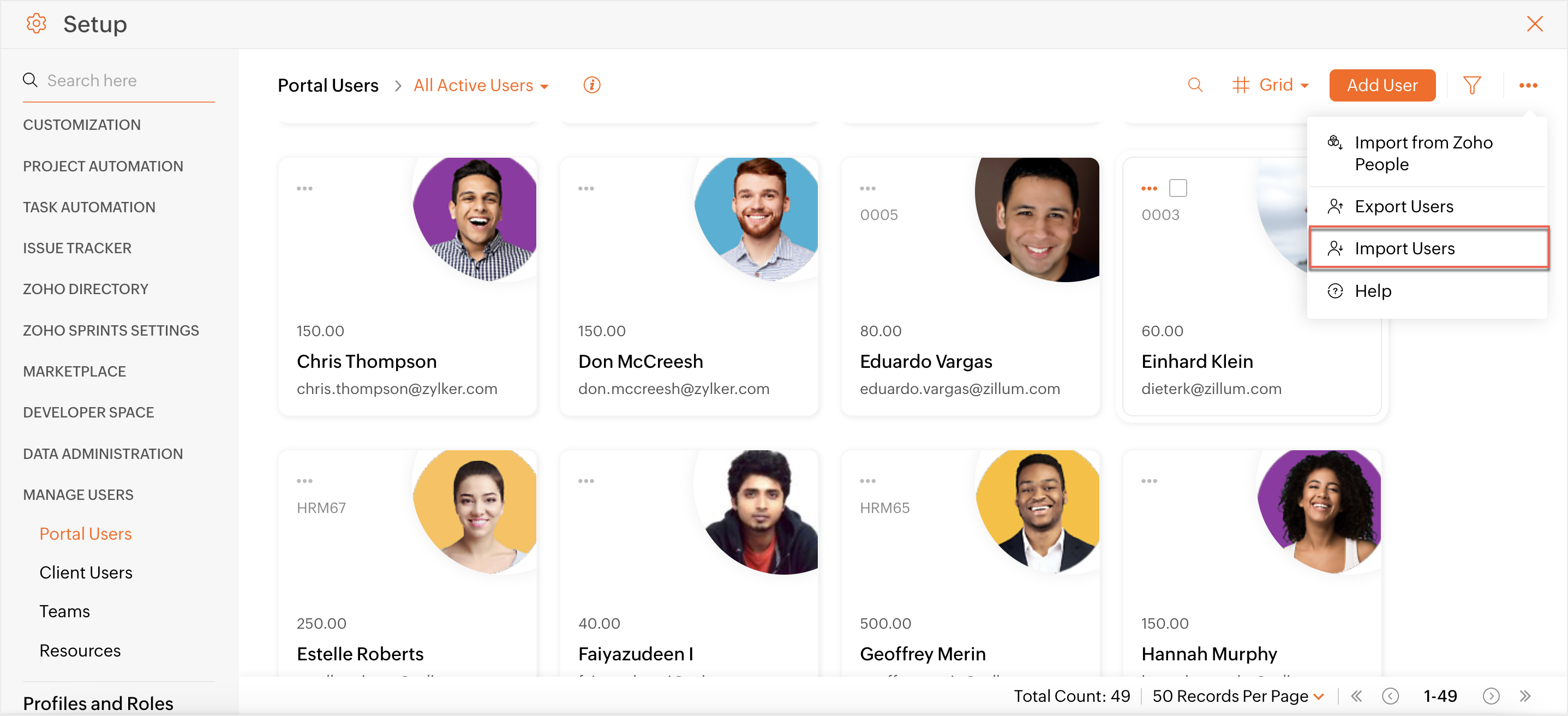 Zoho Projects allows you to import users from a CSV (Comma Separated Values) file. You can now bulk import users into your Zoho Projects portal using CSV files. A sample file is attached below.