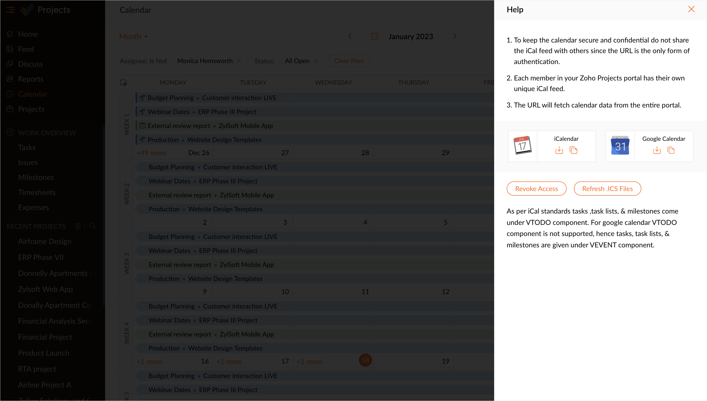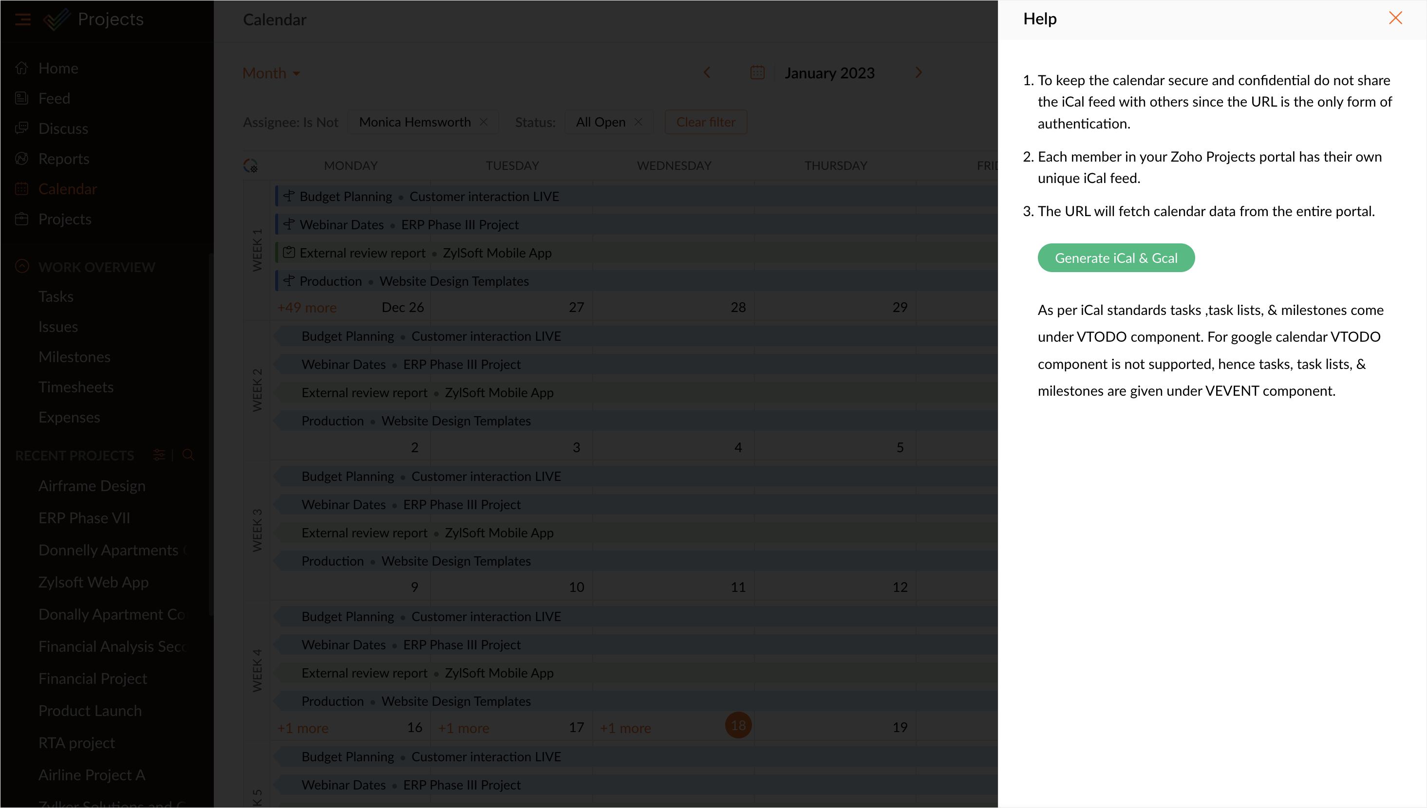 Project events like tasks, milestones, and meetings from Zoho Projects are automatically displayed in your Google calendar.