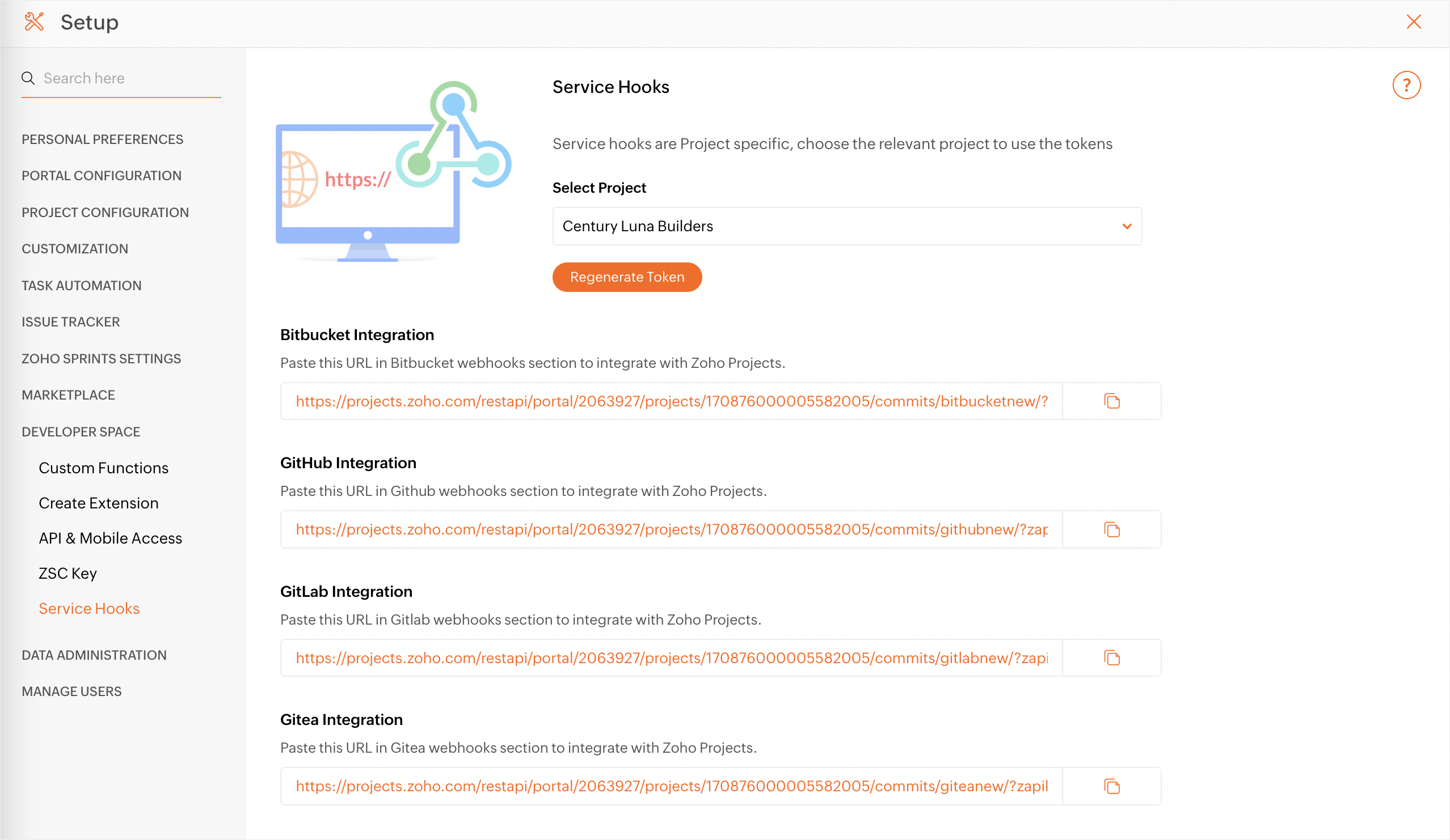 You must copy the Service Hook URL in Zoho Projects to map the specific project with Gitea. Navigate to > Developer Space > Service Hooks. Copy service hook URL from Gitea Integration and paste it in Gitea.