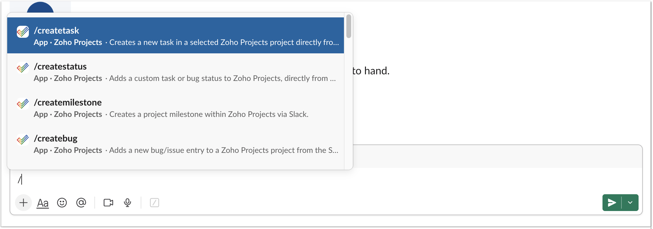 Use slash commands and add your project entities from Slack to Zoho Projects.