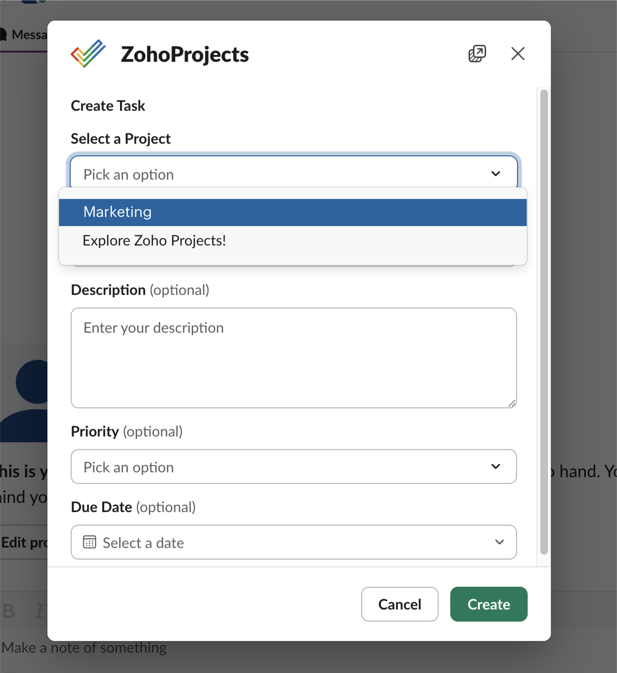 - Create Task form will show up on screen, select project "Marketing" and add necessary task details.