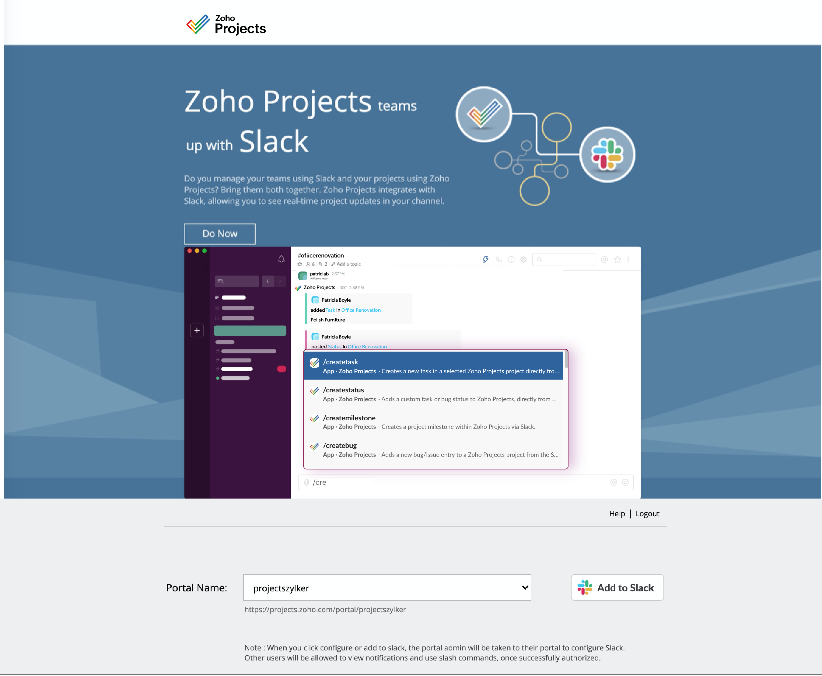 - Click Zoho Projects and click Add to Slack.