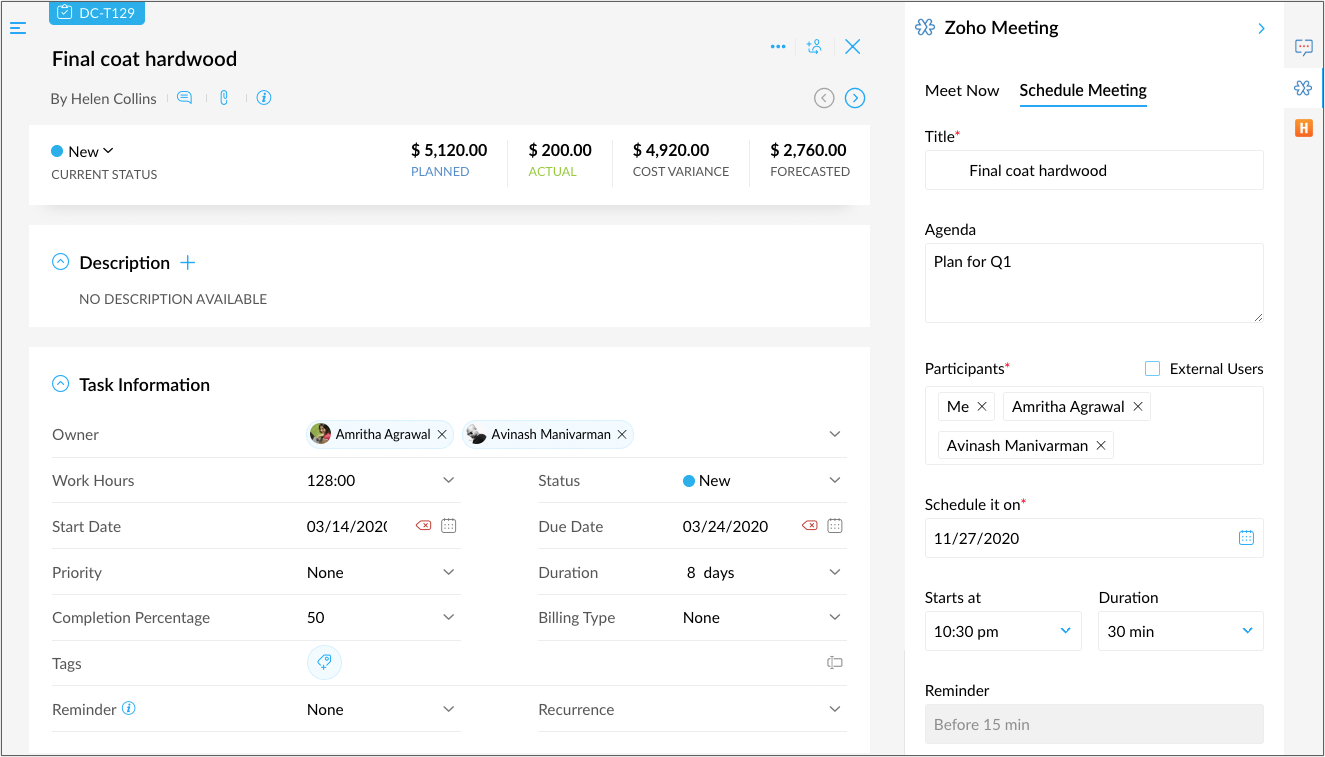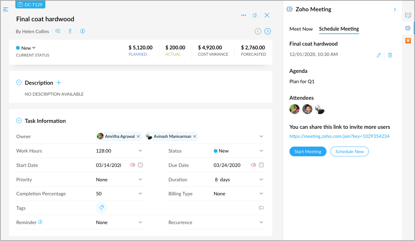 Start your meetings instantly or schedule meetings from the task details page.