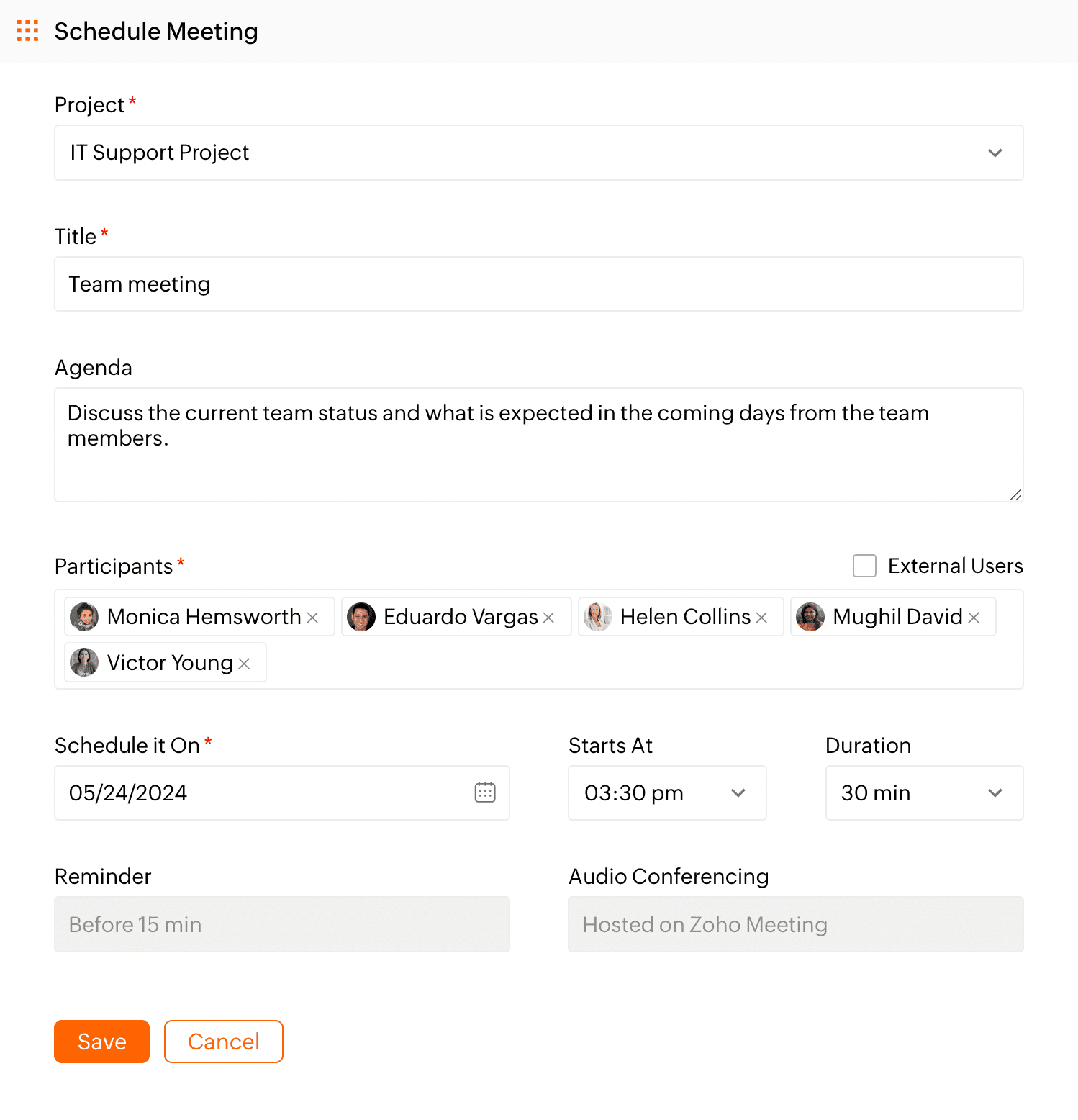 Online meetings are now just a couple of clicks away. Start an online meeting with our Meeting integration. Navigate to Zoho Apps under Integrations in your Zoho Projects setup and enable Zoho Meeting. To schedule meetings from calendar and task details page, you need to upgrade your Zoho Meeting subscription and enable the integration in Zoho Projects.