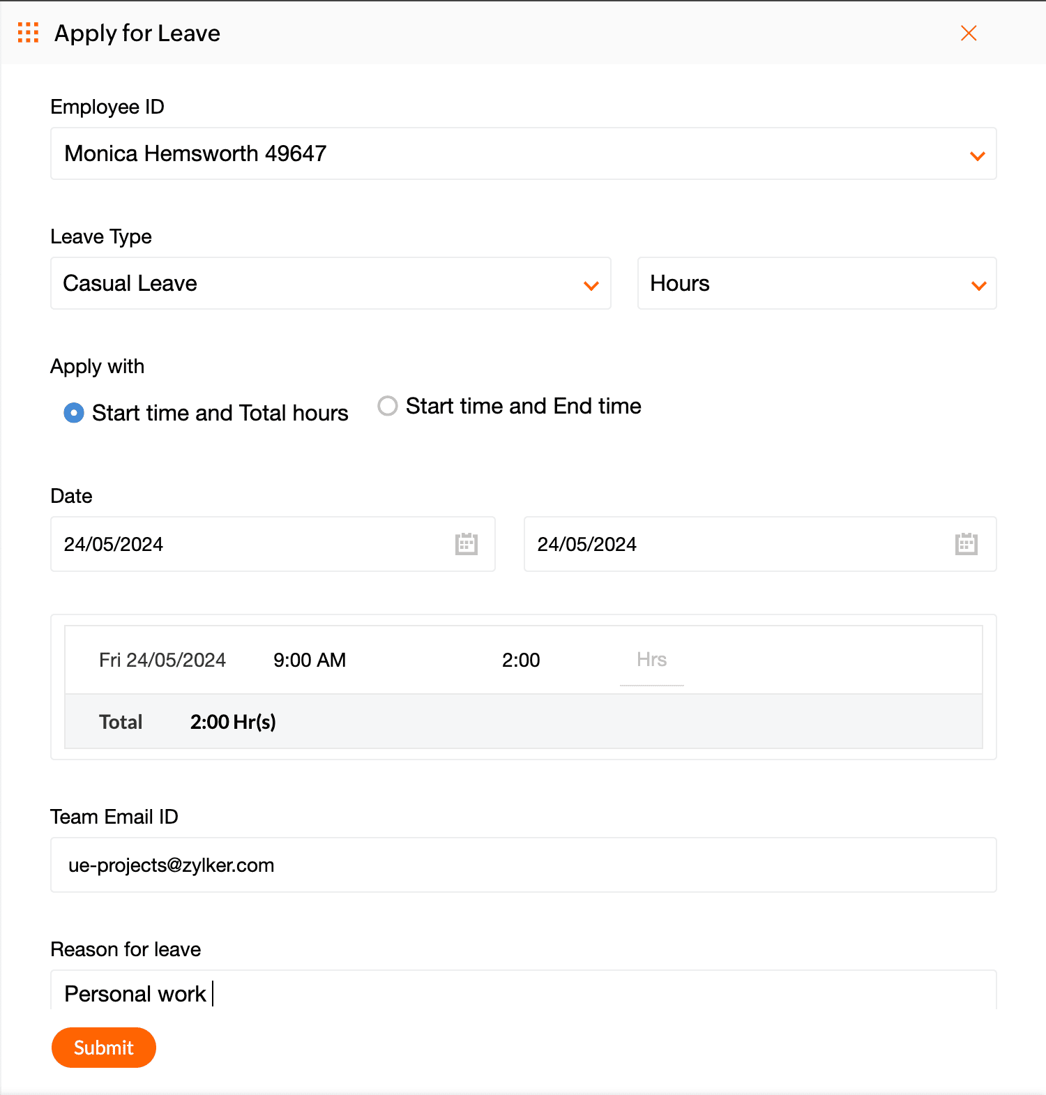 If you choose the 'Days' leave type, you can select dates and either apply for a full day, half day or quarter day. If you choose the 'Hours' leave type, you can select a specific date and time.