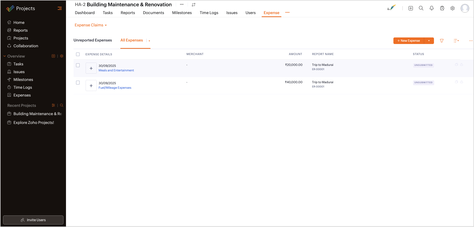 Choose Expense Claims & Expense Reports (Powered by Zoho Expense) to track expenses.