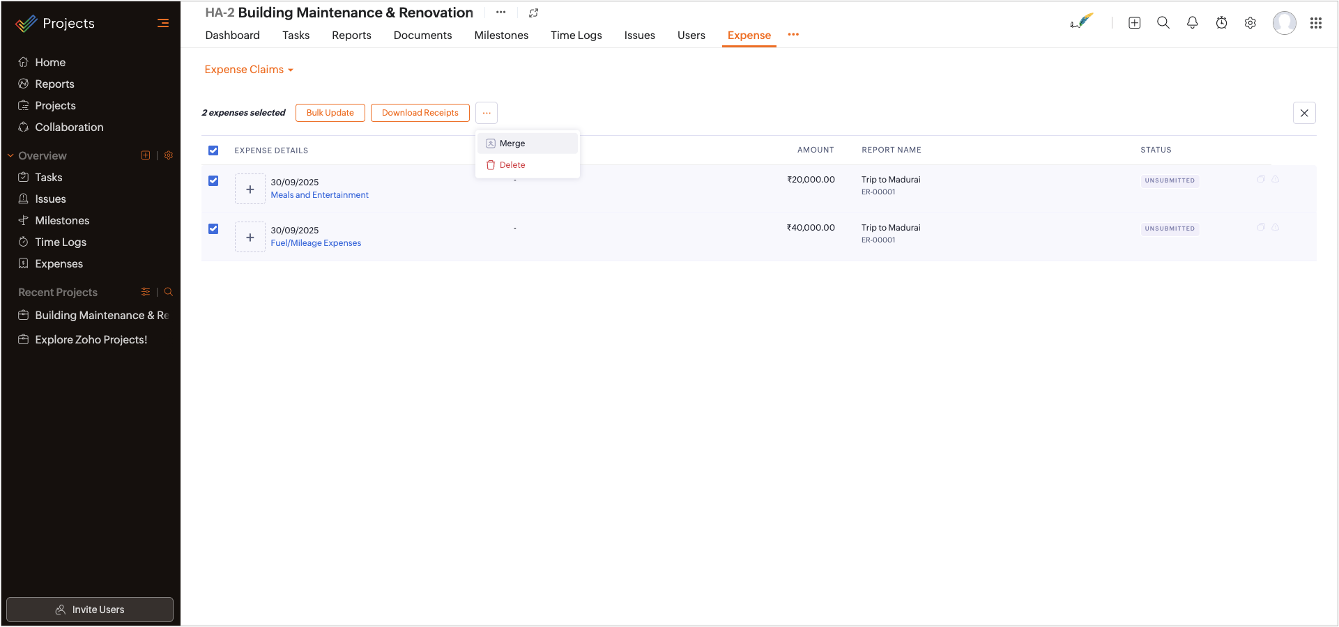 2. Under Expense Claims select any 2 expenses which you would like to merge.