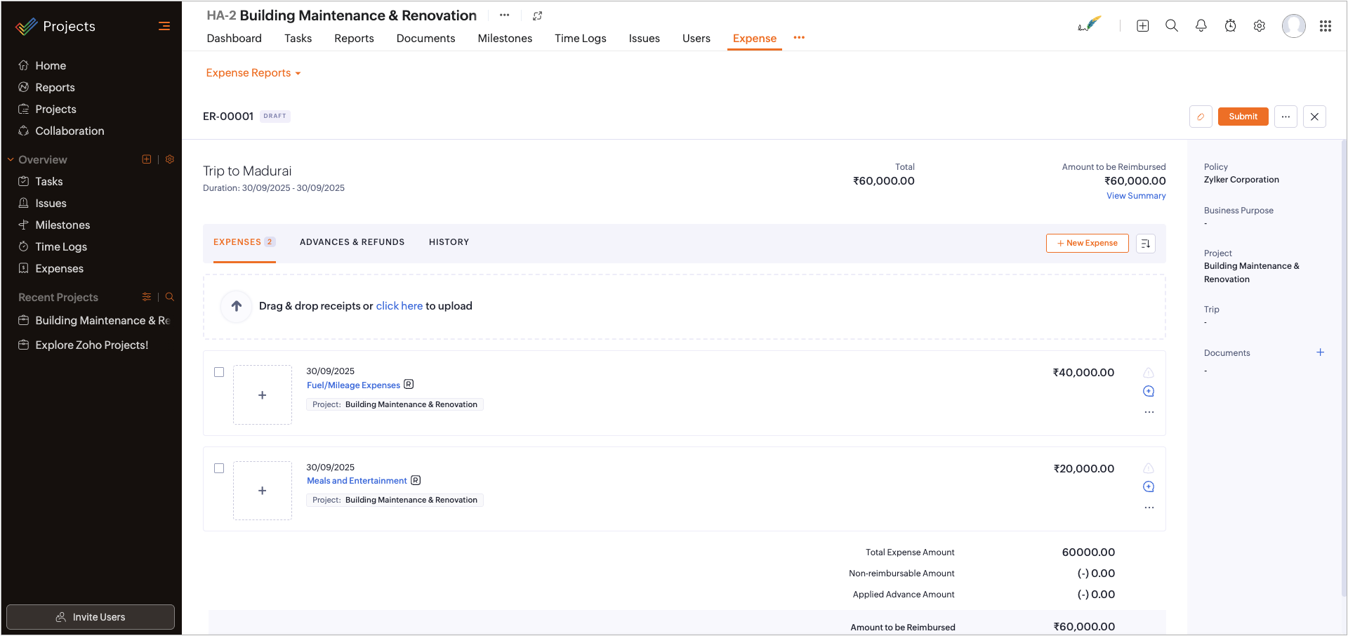 Zoho Expense integration lets you track and manage project related day-to-day expenses of your employees.