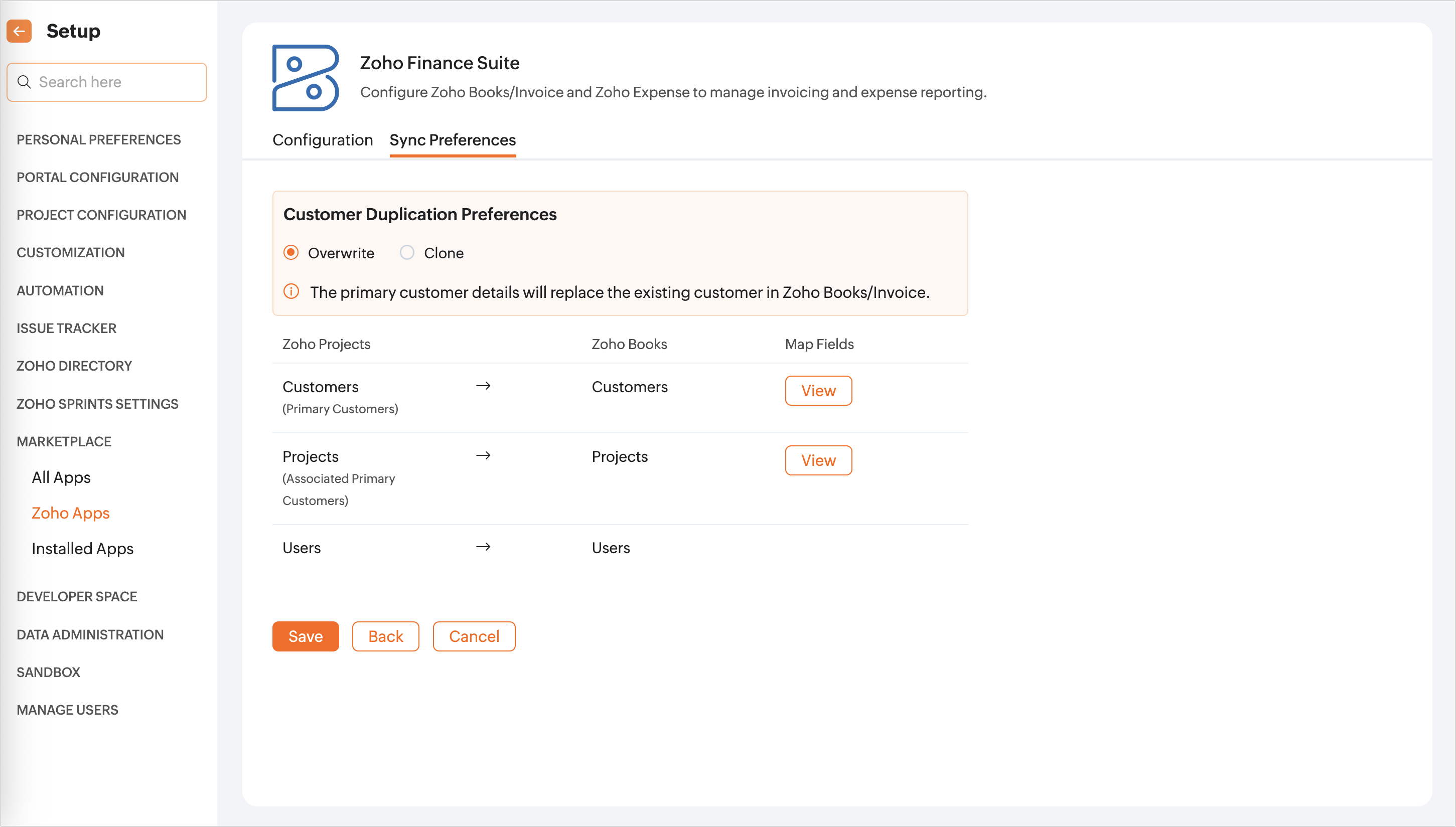 Overwrite: Customers in Zoho Expense will be overwritten if their name is same in Zoho Projects. Zoho Projects Customer will be linked with the existing customer in Zoho Expense.