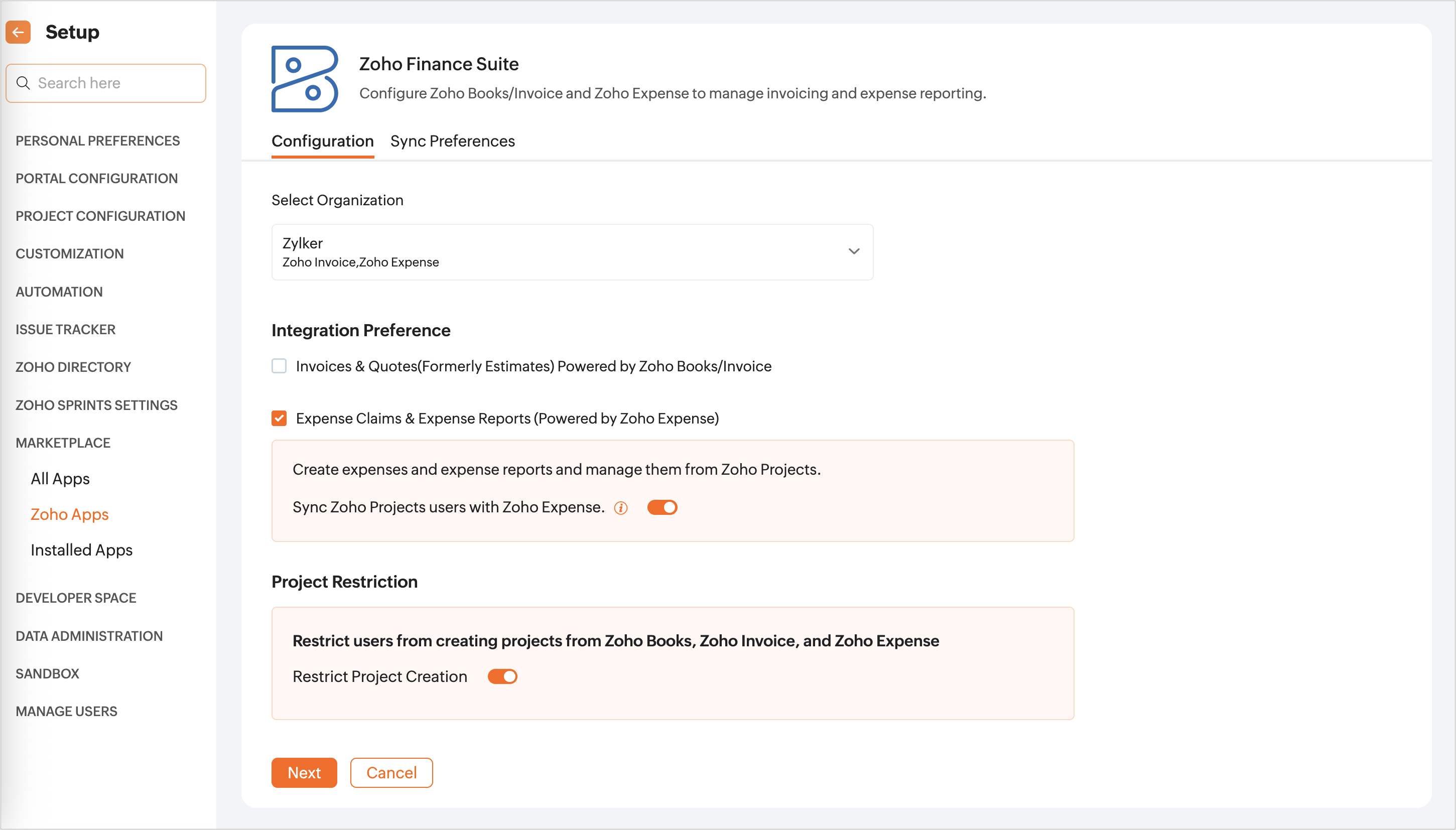 7. Toggle the option Sync Zoho Projects users with Zoho Expense if you want to add users from Projects to Expense.