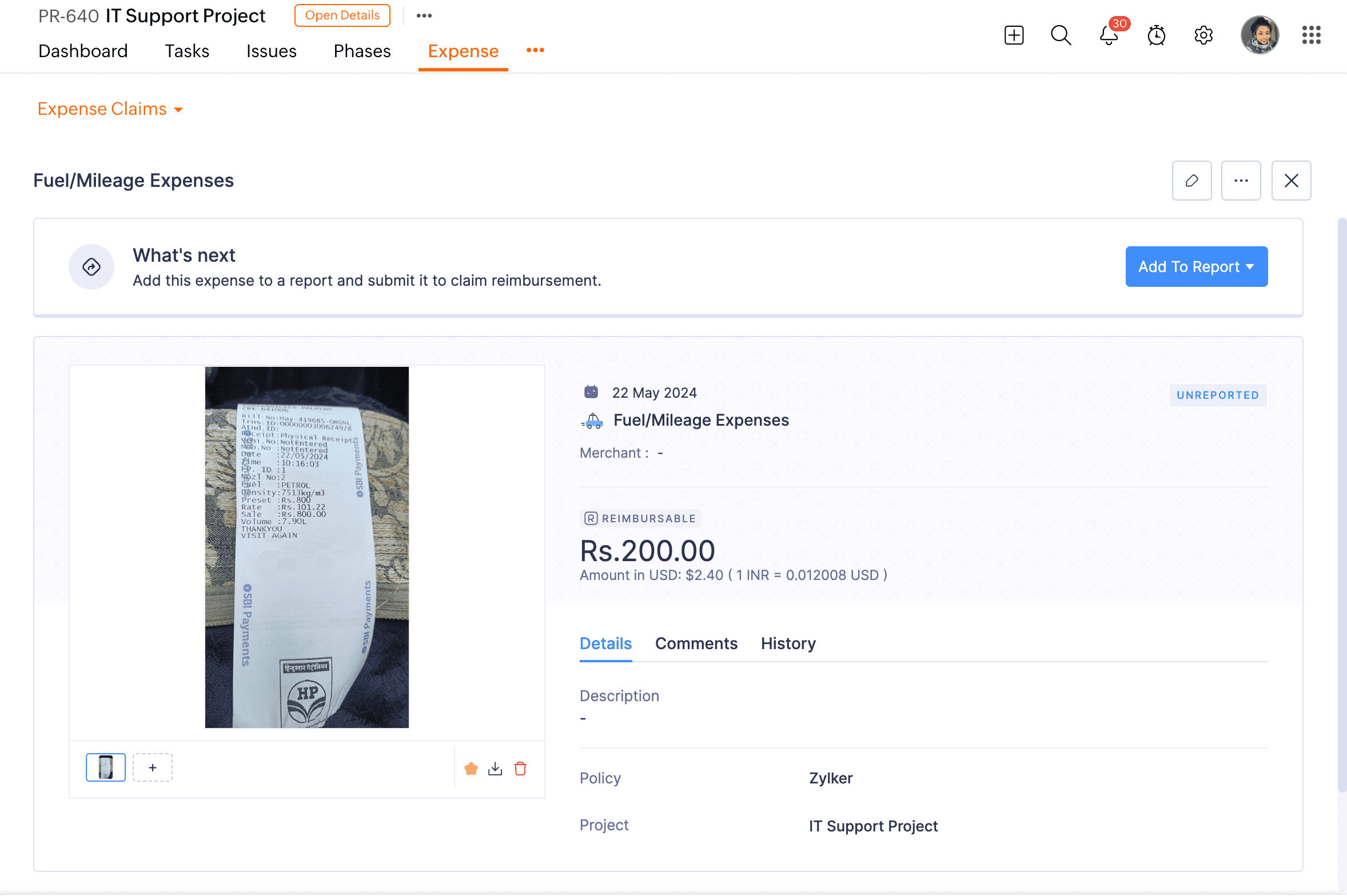 In the below screenshot, you can view a bill of the fuel expense incurred while travelling to the venue where the User meetup is conducted. This is added as an expense in the Expense tab directly from the respective Project in Zoho Projects.