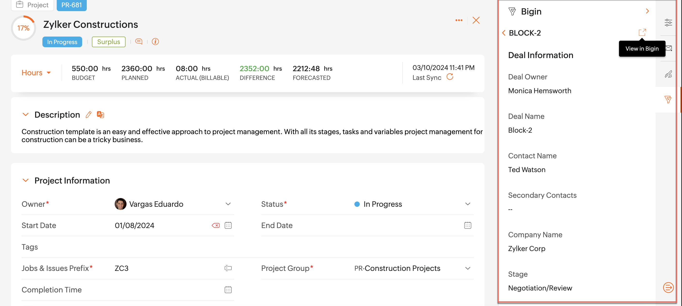 This integration allows two-way sync of Client Companies and Contacts. Any changes made to Client Companies and Contacts in Zoho Projects or Bigin are automatically reflected in both, keeping client data accurate.