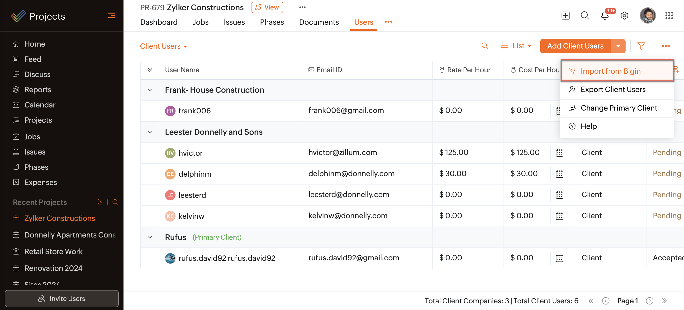 3. Click  in the top-right corner, select Client Users and click Import from Bigin.
