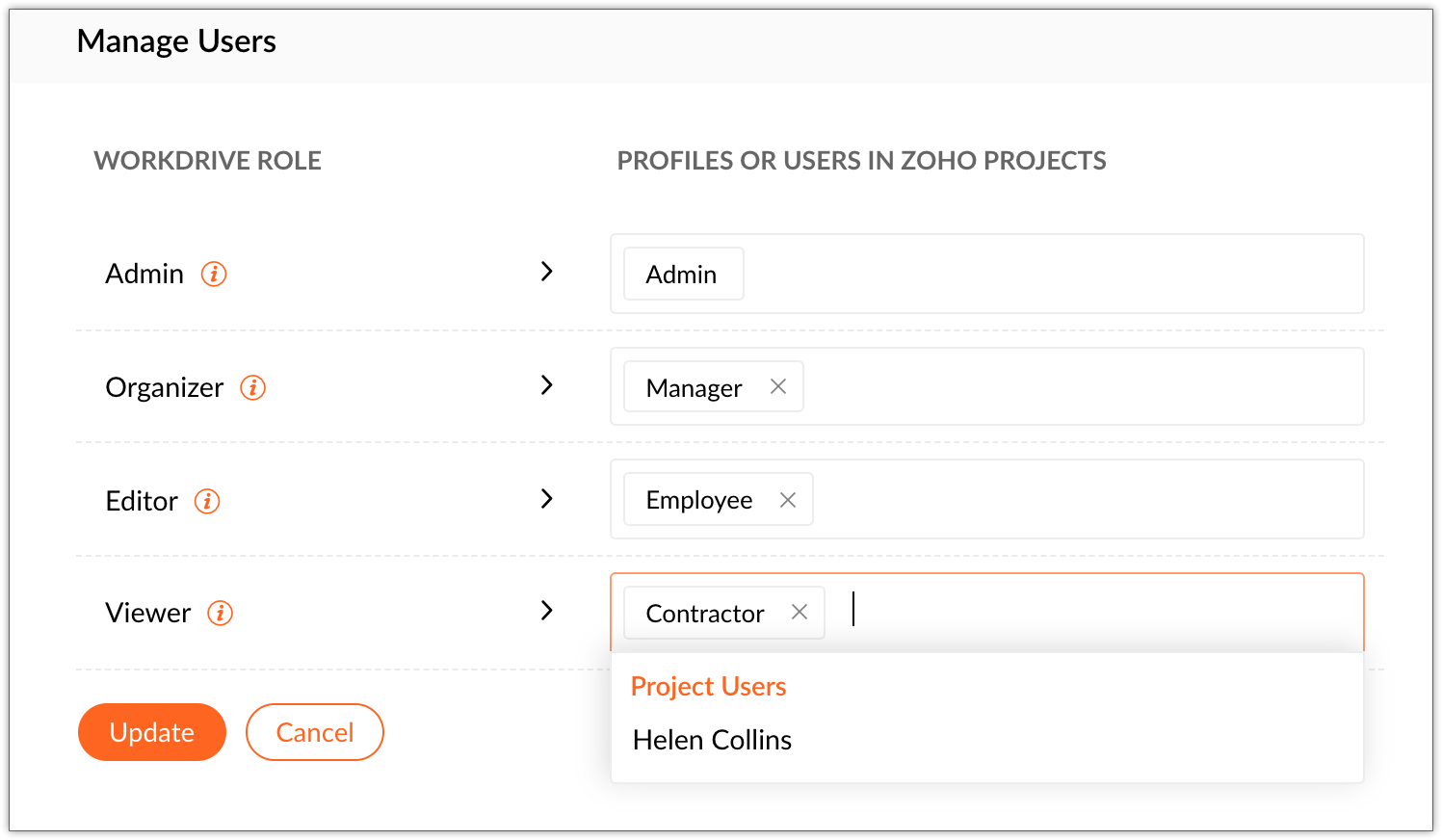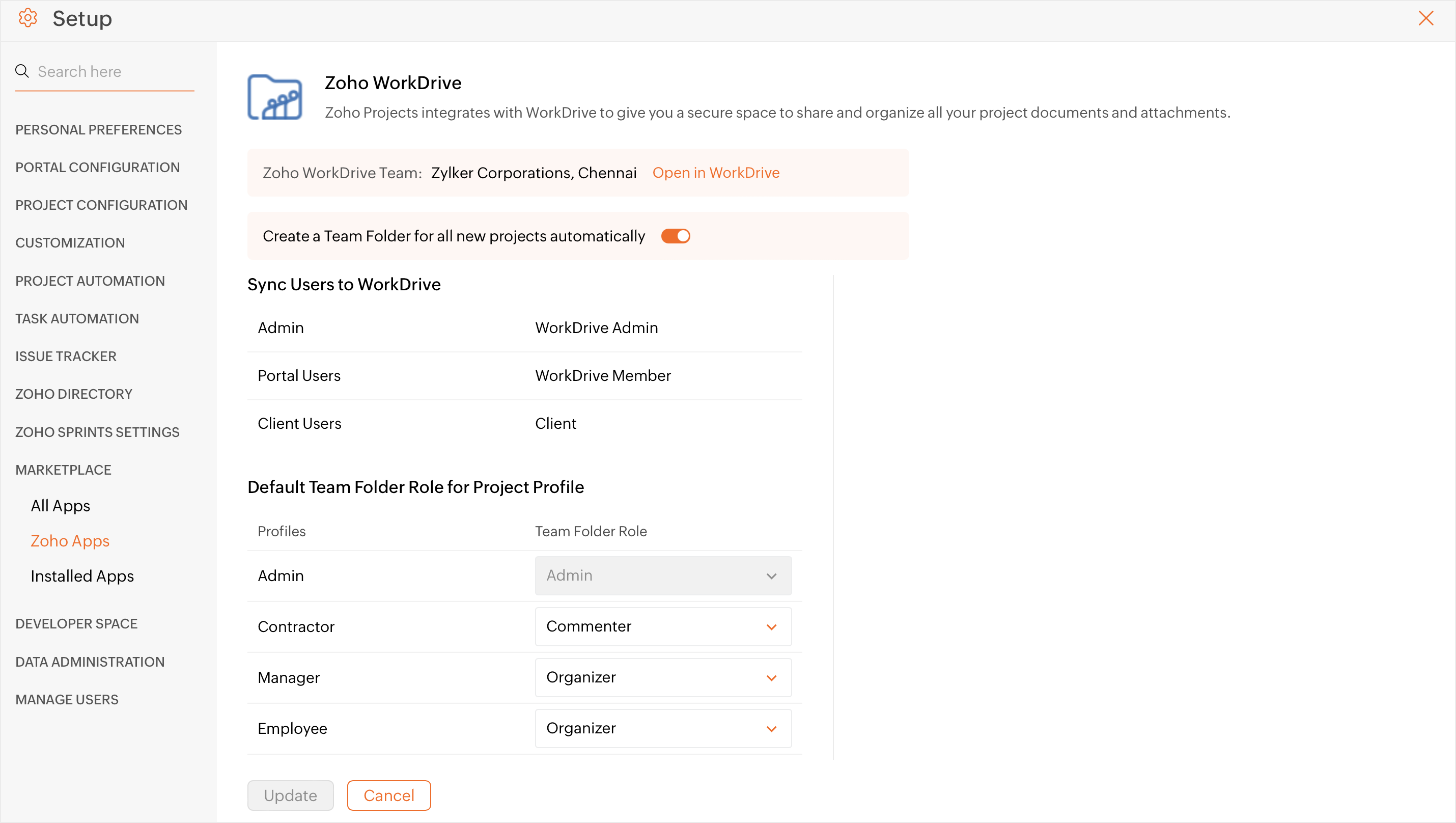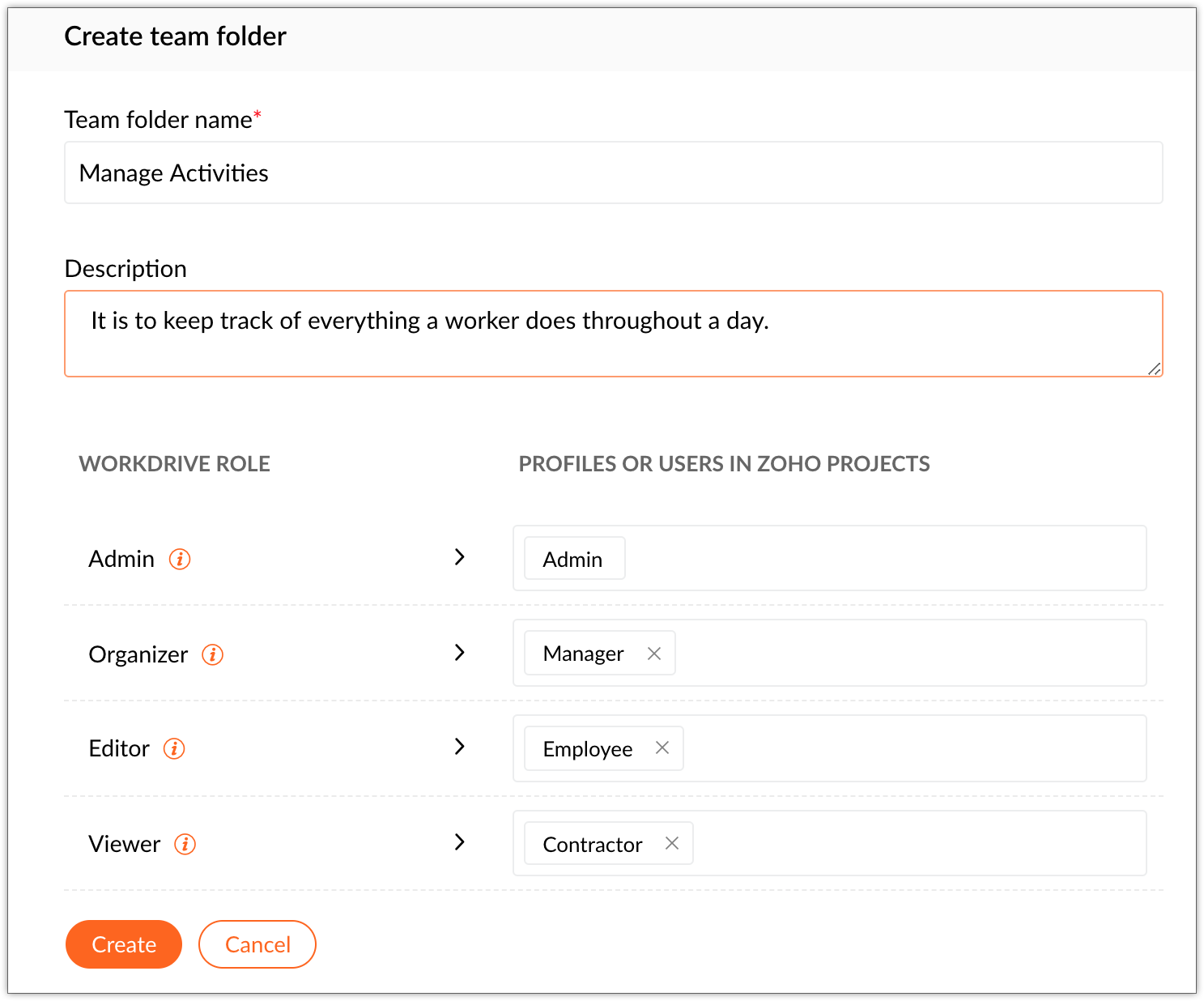 Users can be granted completed access or restricted with certain privileges from this section. Selecting the Zoho Projects Profile against the WorkDrive Role will grant the users of the said profile with the relevant permissions in the team folder.