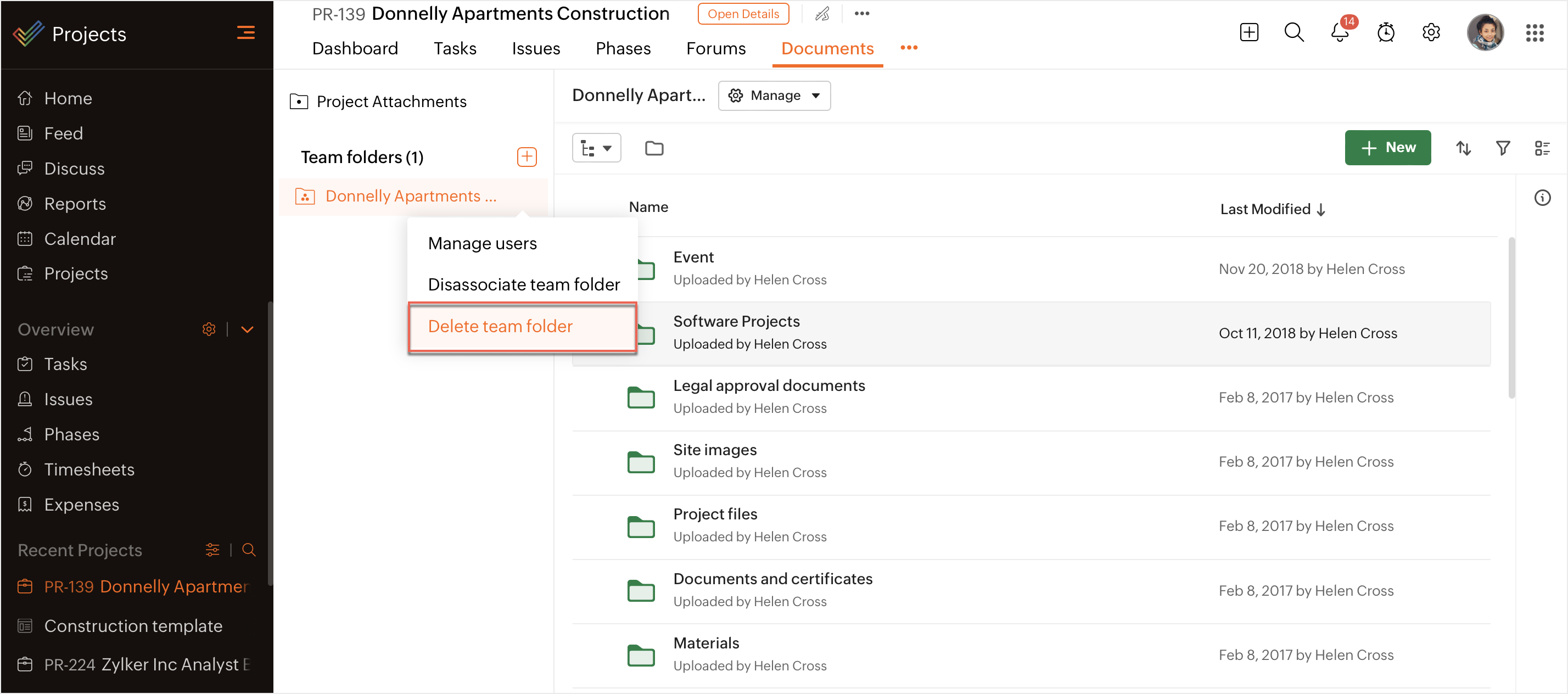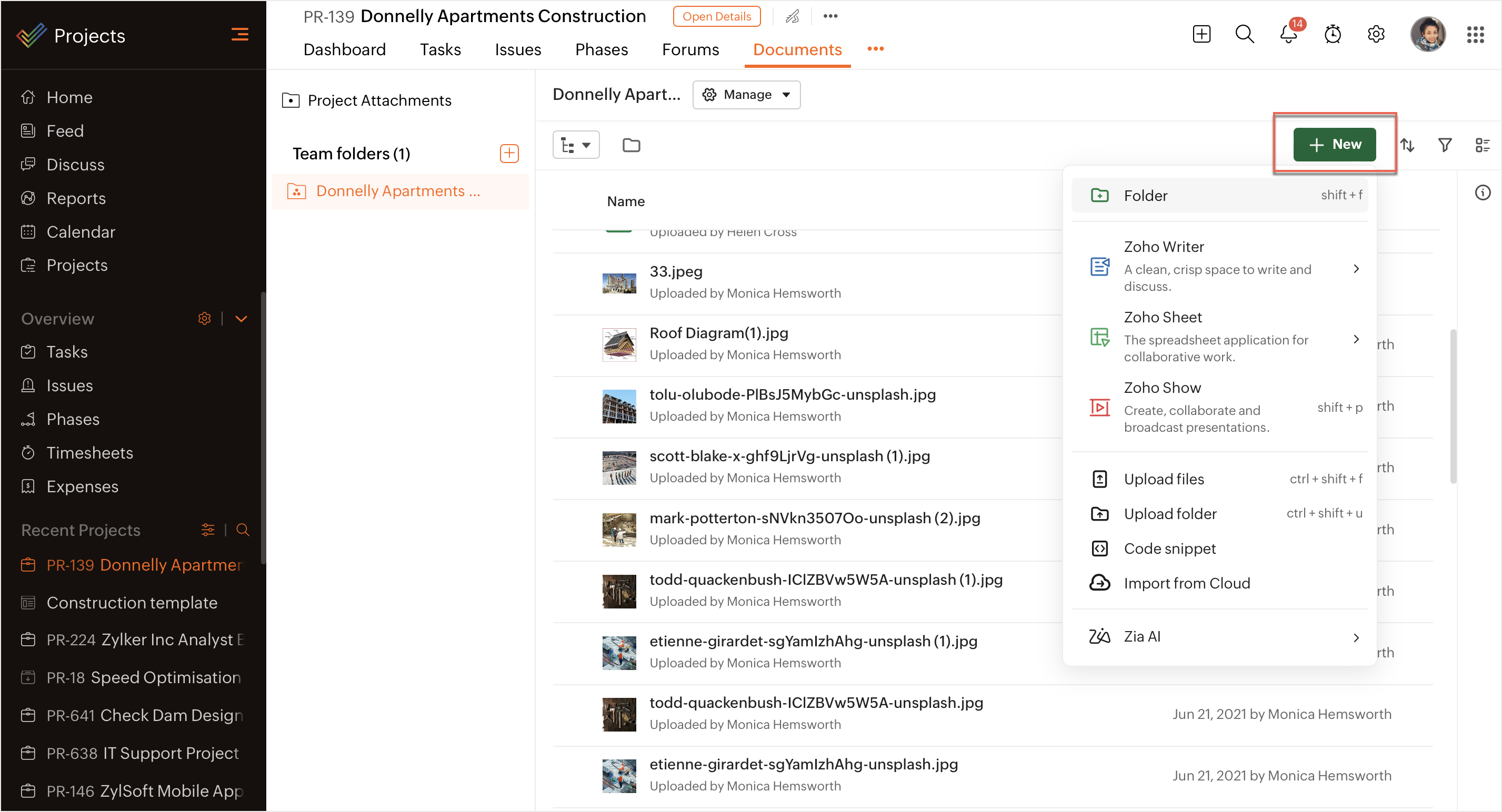 Zylker constructions has to maintain numerous papers related to their construction site, including contracts, architectural designs, structural designs, floor plans, site plans, and much more. These documents are highly private, and should only be accessed by authorized individuals. Although Zoho Projects allows you to store documents within each project, project administrators must restrict users' access to all documents of the project. This can be overcome by integrating Zoho WorkDrive and Zoho Projects.
