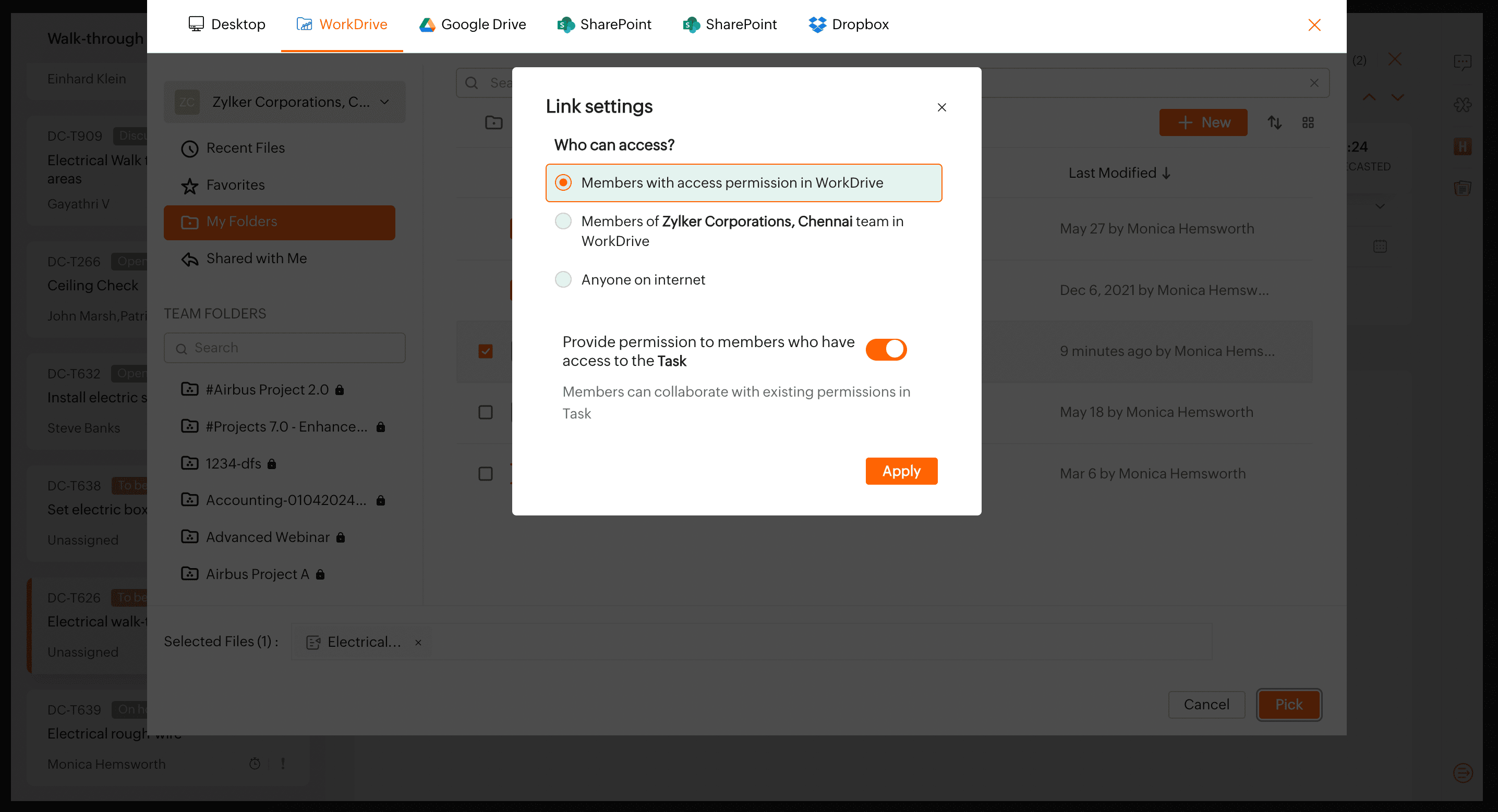 Let's say there is a task called "Electrical wiring" to complete the electrical activities in the building. You attach the electrical wiring plan to the task for reference to the task owner. You would like to restrict the access of this document to the users who can access this task. If Zoho WorkDrive integration is enabled, you'll be prompted with "Who can access?" setting while you add the wiring document to the task. Enable the toggle button of "Provide the permission to members who have access to the task".