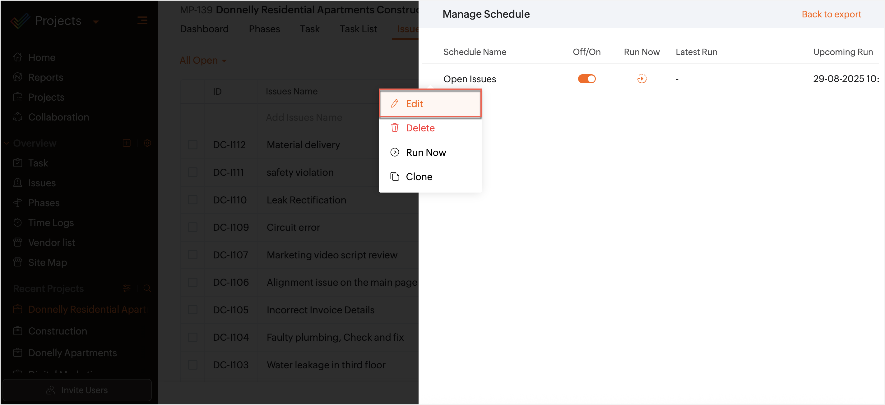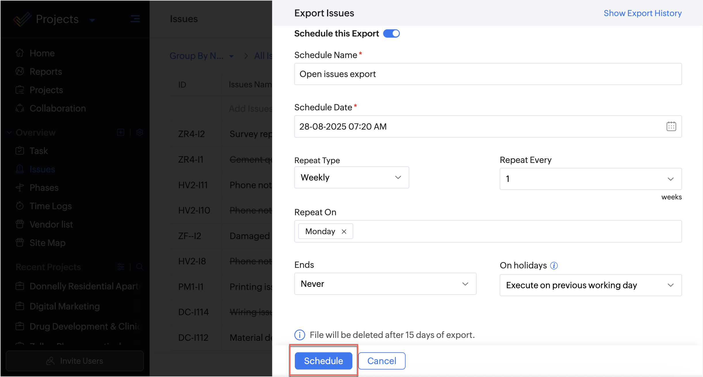 - Go to the Manage Schedule button on the top right of the Export Issues form.