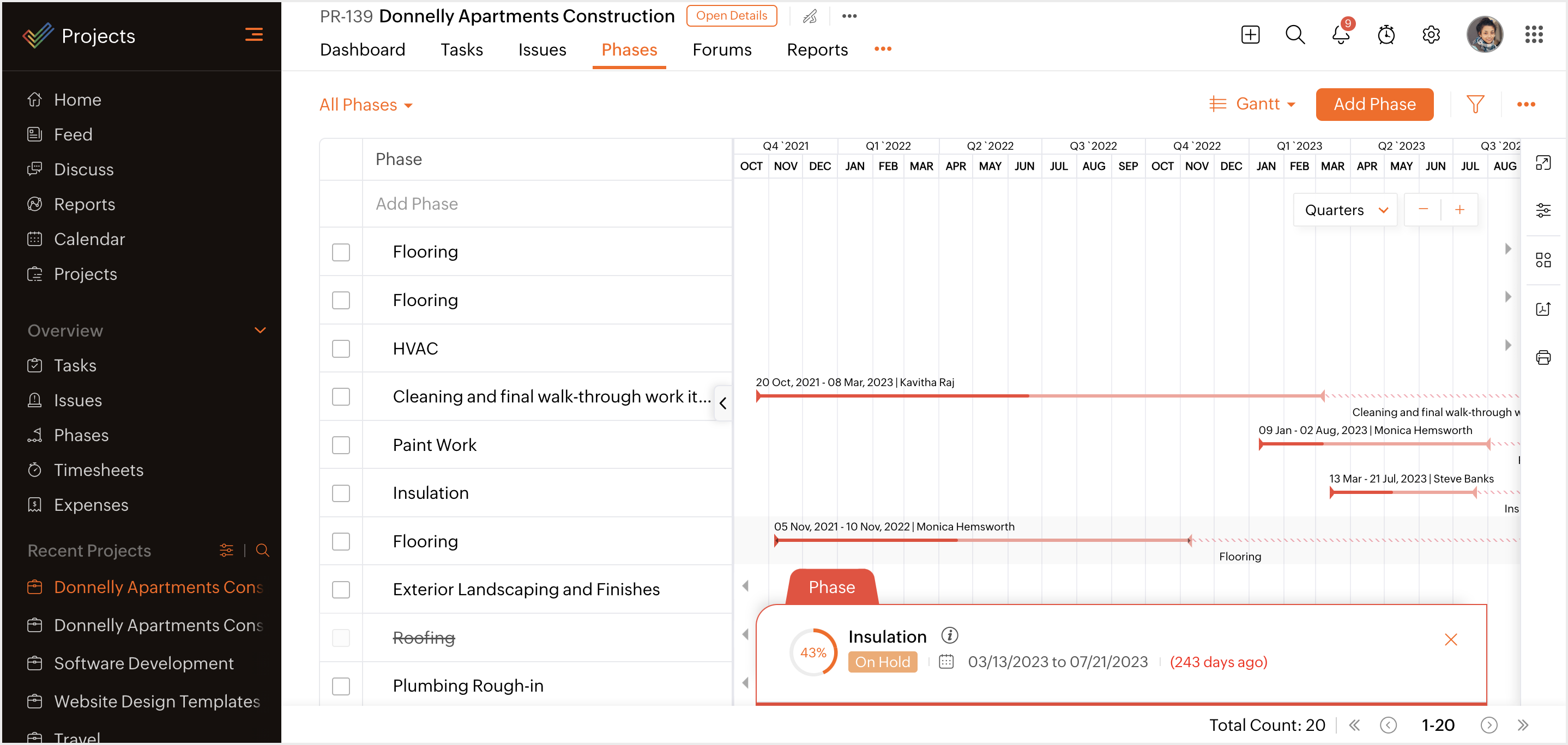 In the Phase Gantt view, you can view the projects and phases on the left and the corresponding bars on the right that show the actual schedule.