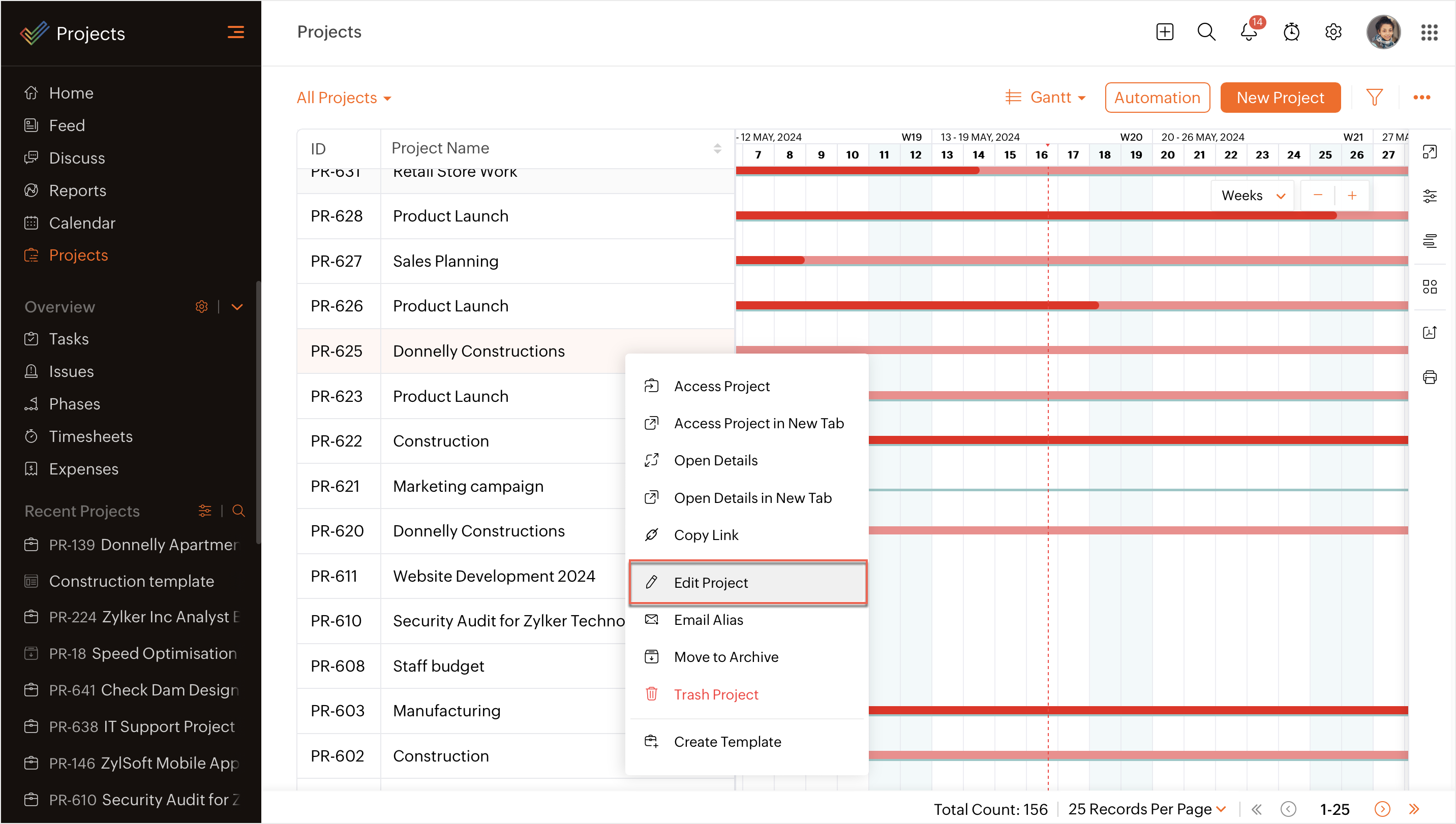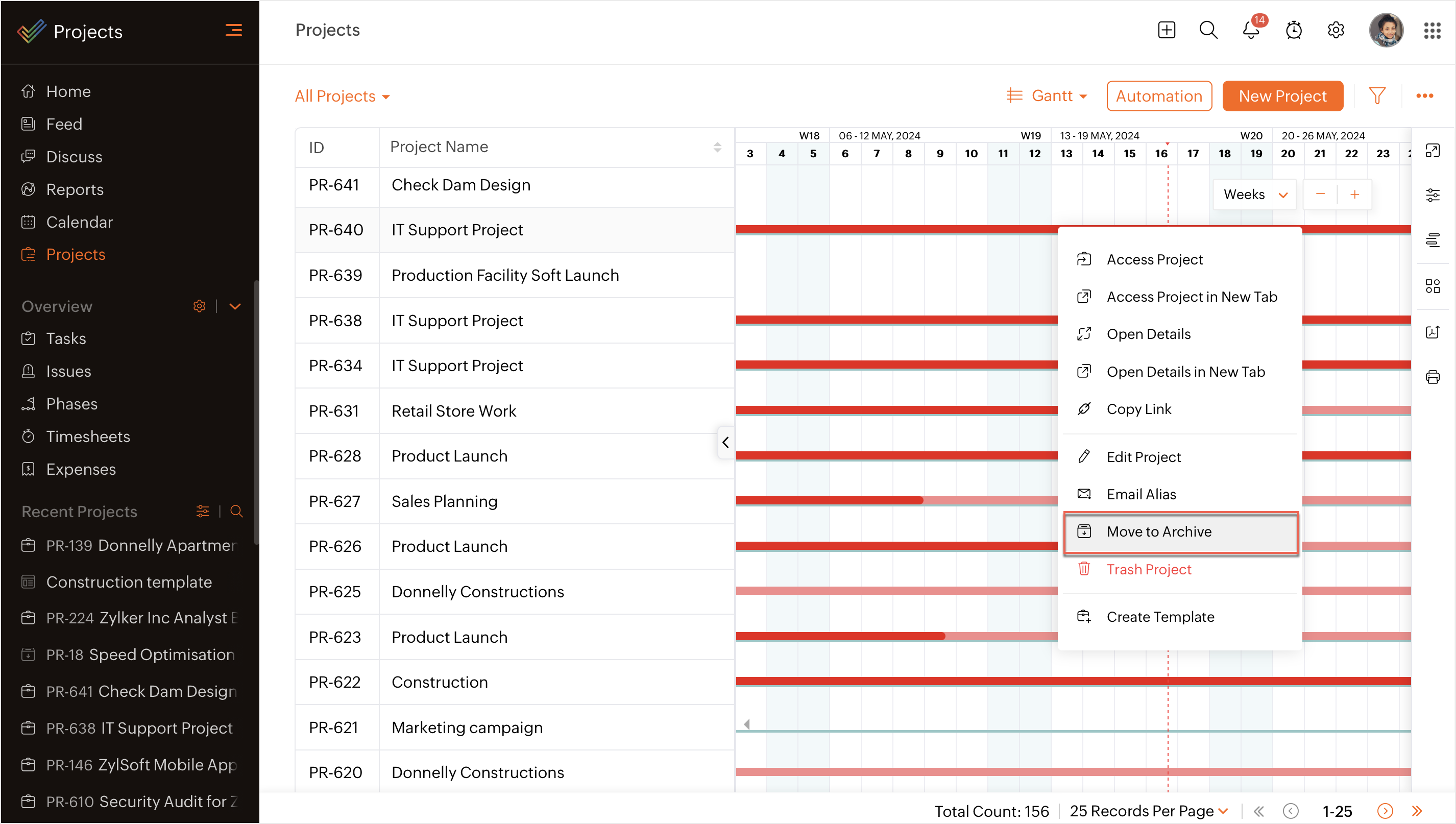 In the Project Gantt view, you can view the projects in the left and the corresponding bars on the right that show the actual project schedule.
