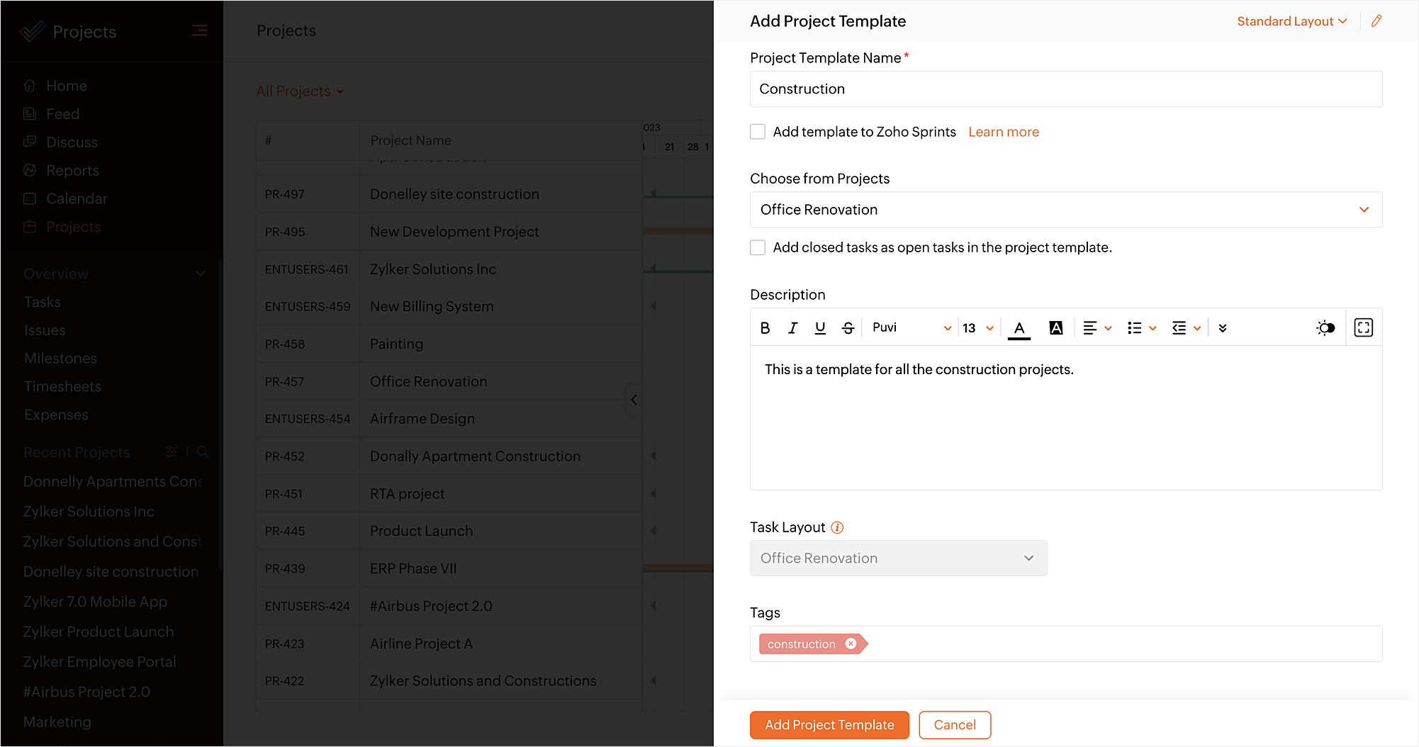 5. Enter Project Template Name and select the project that you want to use as a template in the Choose from Projects drop-down.