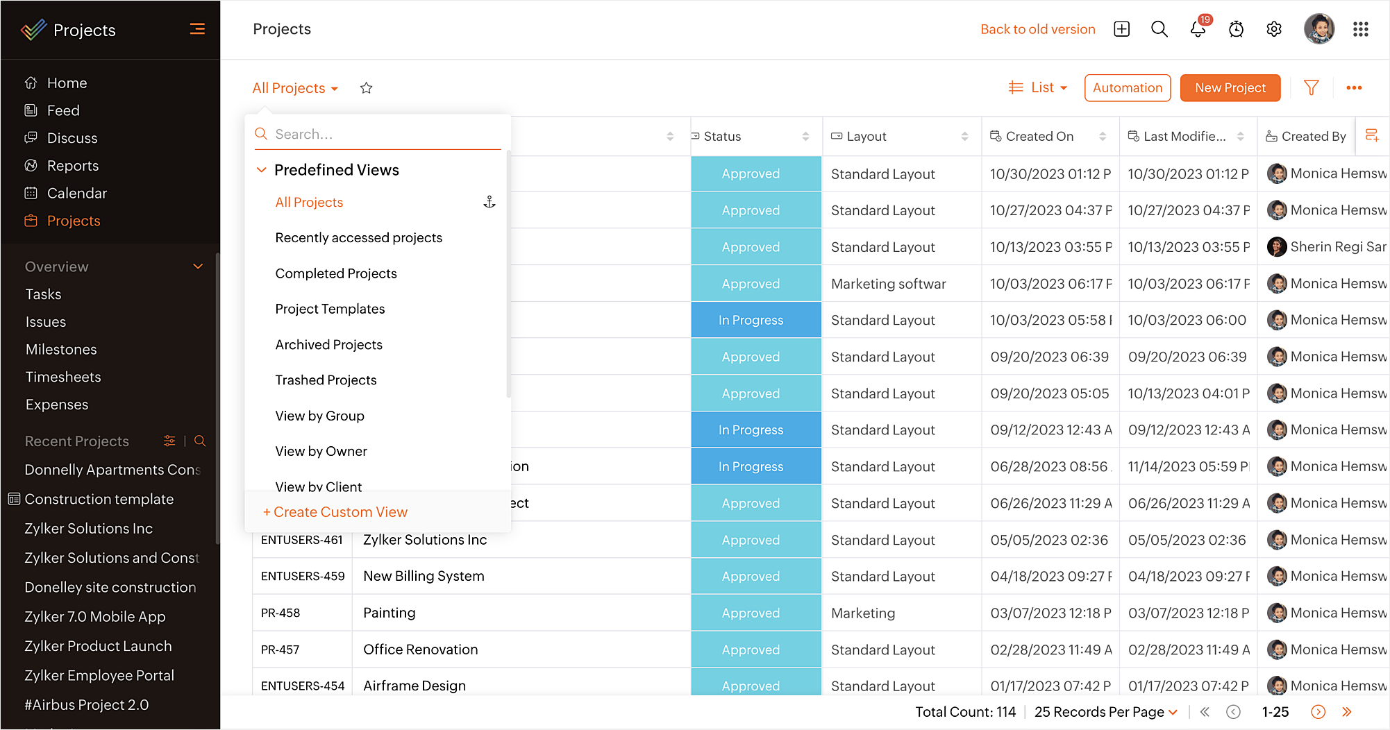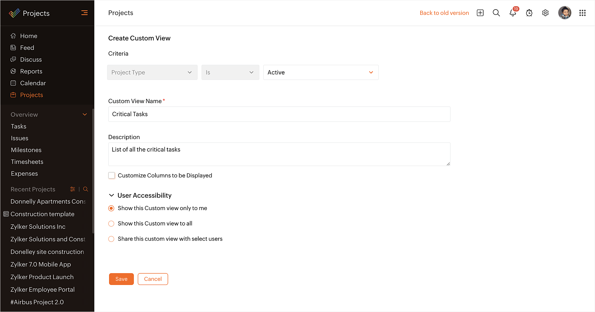 In addition to the predefined views, users can now create their own custom views for projects. Users can customize projects list view based on specific criteria by applying filters. These custom views can be marked favorite by clicking the icon.