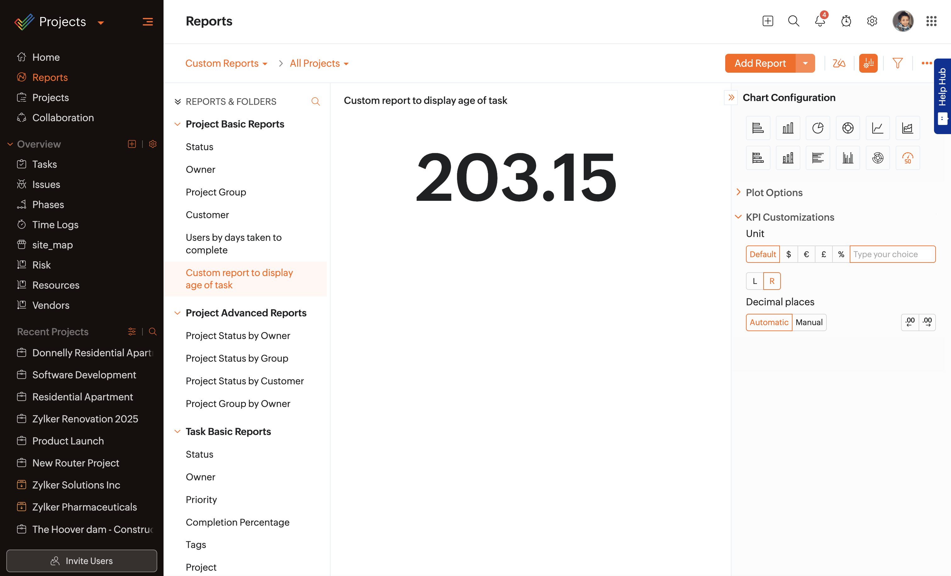 Zoho Projects allows you to display number patterns of Key Performance Indicators in your reports. It can be used to showcase large figures with units and decimal places such as your revenue, sales target, or even adoption percentage.
