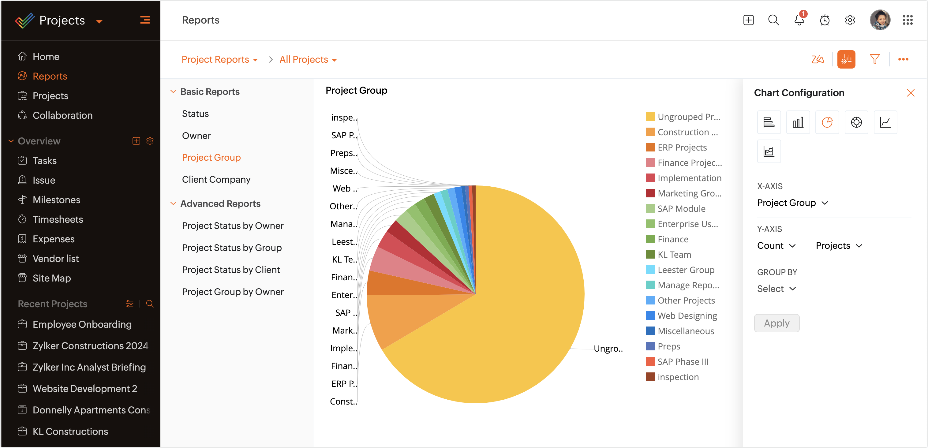 1. Basic Reports: View project count by Status, Owner, Project Groups, and Client Company