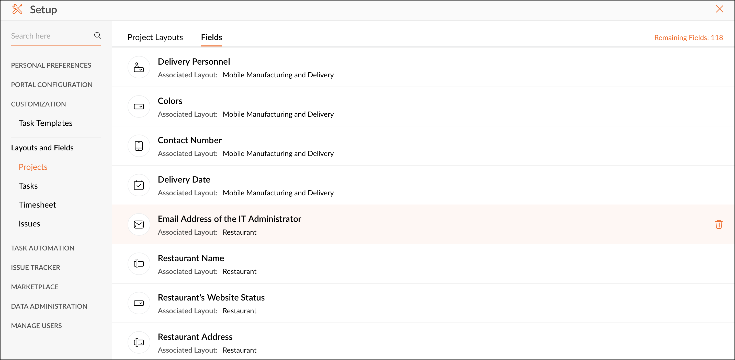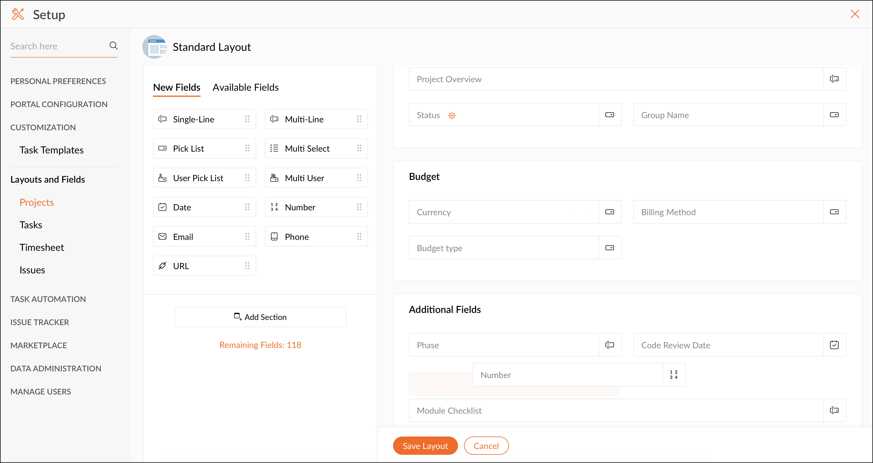 Customize fields to collect project details based on your project requirements. You can add a new field or an existing field to your layout.