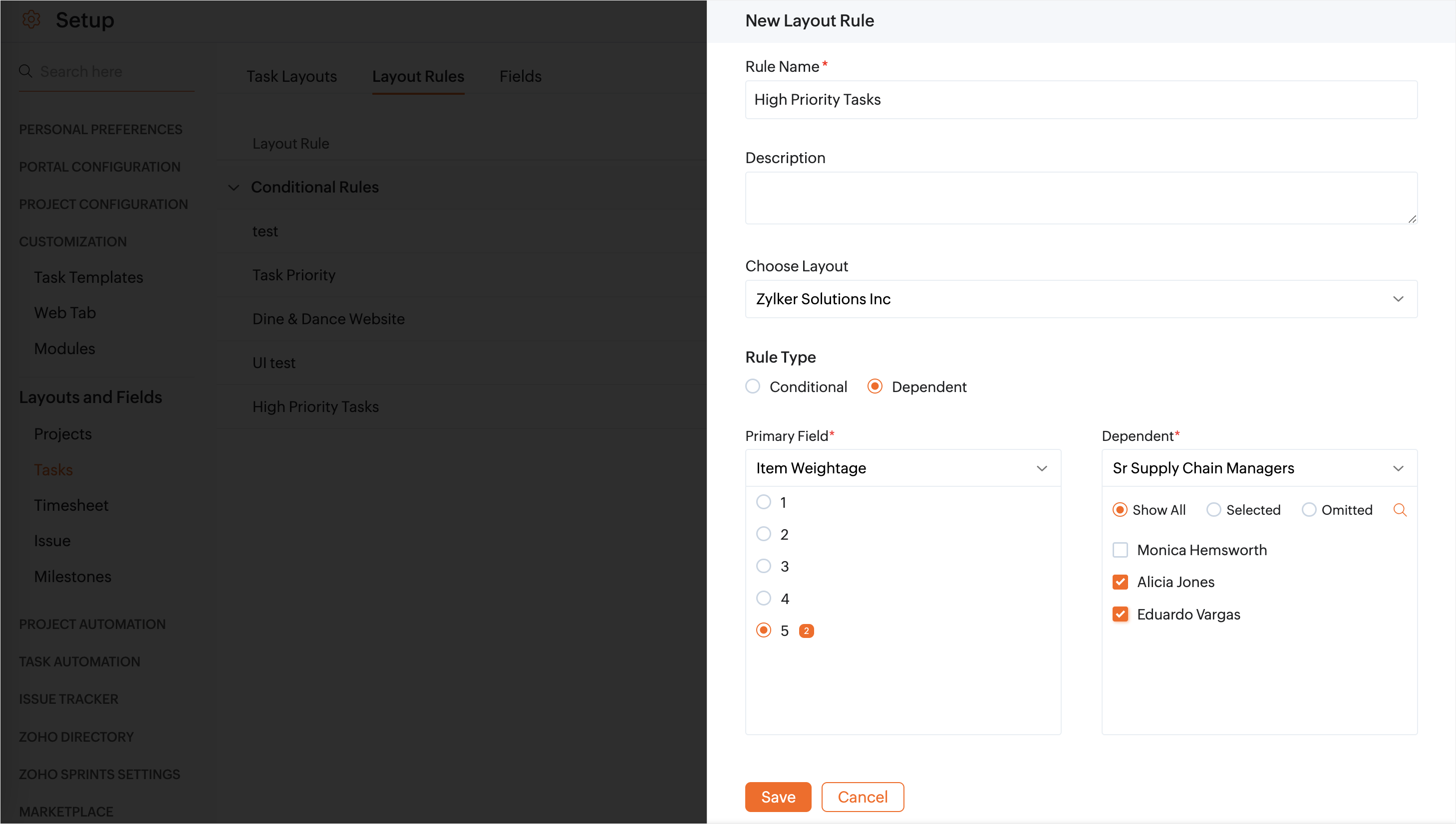 Dependent Layout Rule allows users to view specific values in a field on the Add task form, based on a value selected in another field. For e.g., an organization assigns weightage to items when tracking material, and items with higher weightage are to be tracked by specific managers. So a dependent layout rule is created as shown. The primary field is set as Item Weightage and the highest weightage is selected. Then the dependent field is set to Sr Supply Chain Managers and specific individuals are selected.