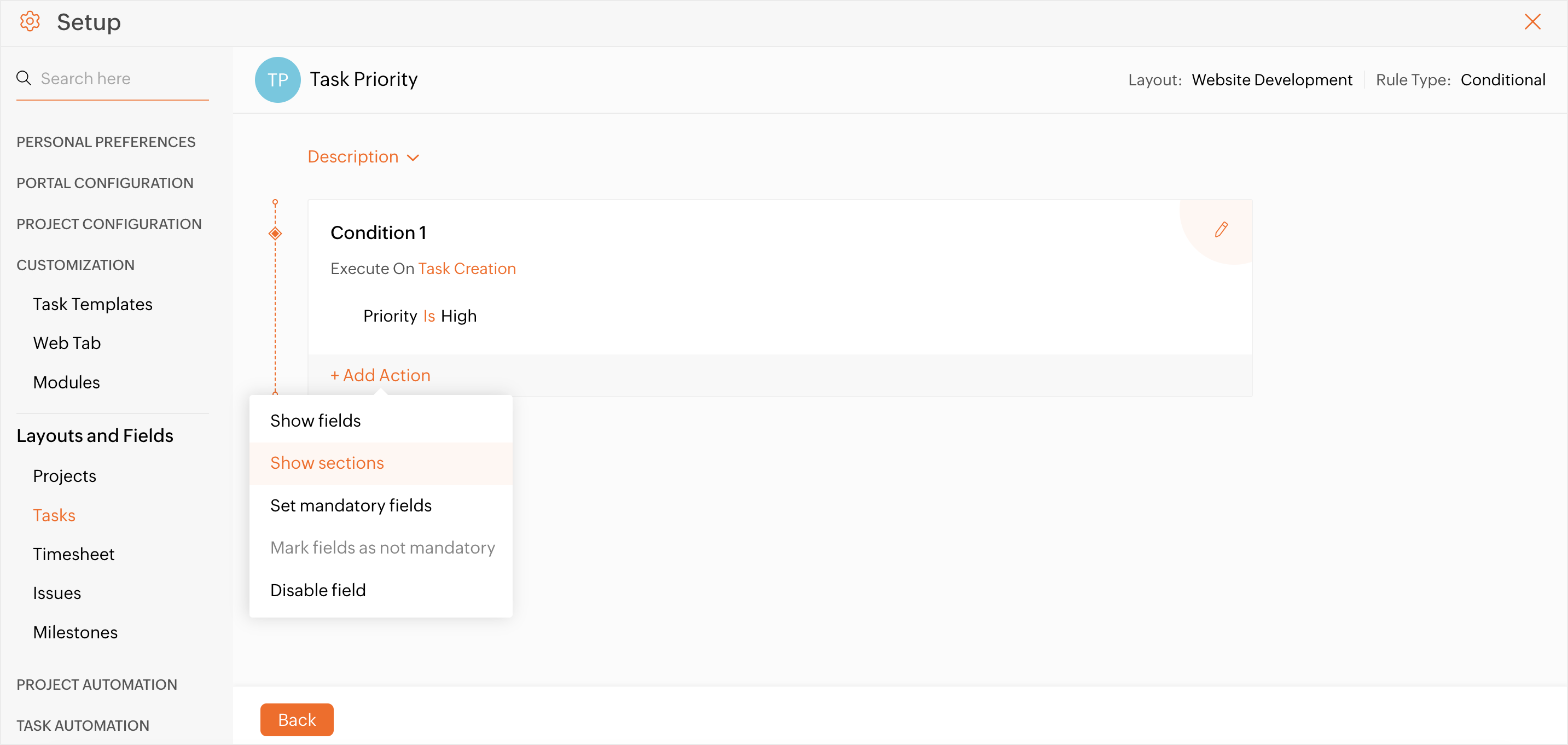 Layout Rules in Zoho Project helps you customize your Add Task form layout based on the certain conditions and criteria. To create a layout rule, you must create a condition and an action.