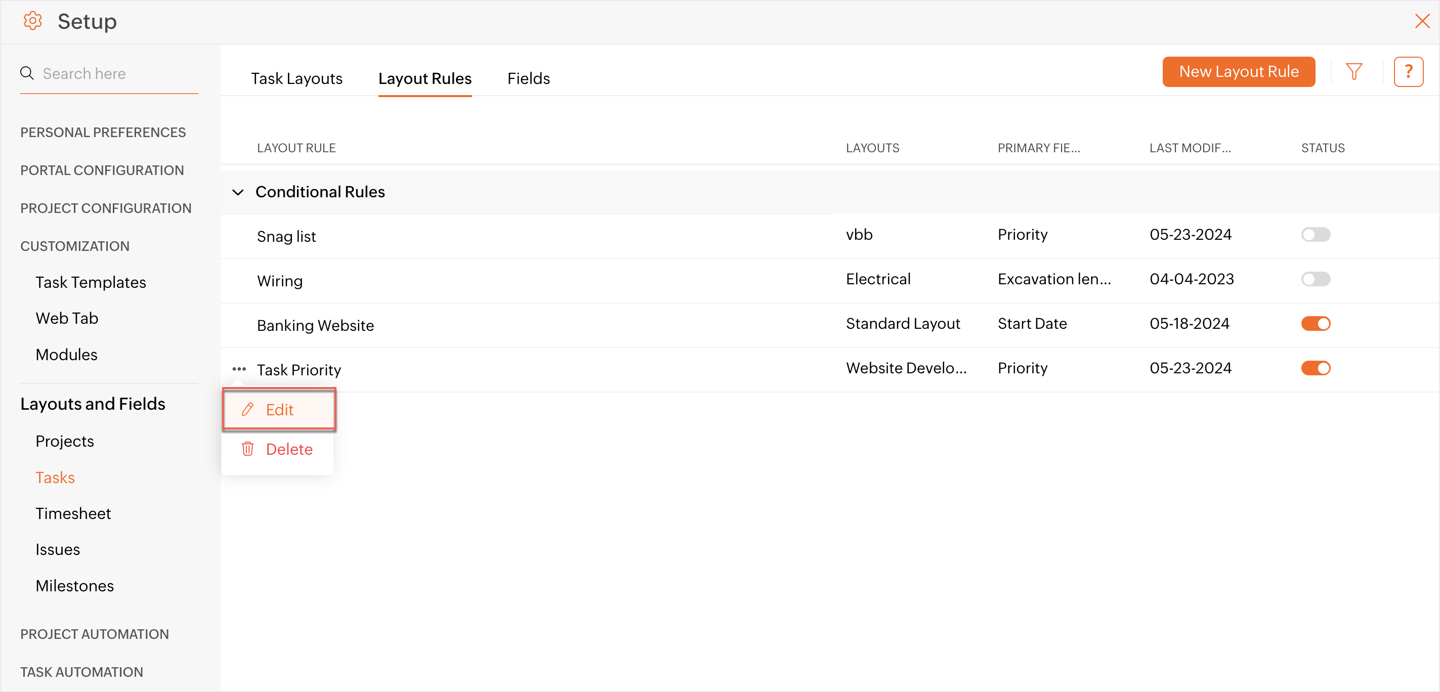 2. Navigate to Customization > Layouts and Fields > Tasks > Layout Rules tab.