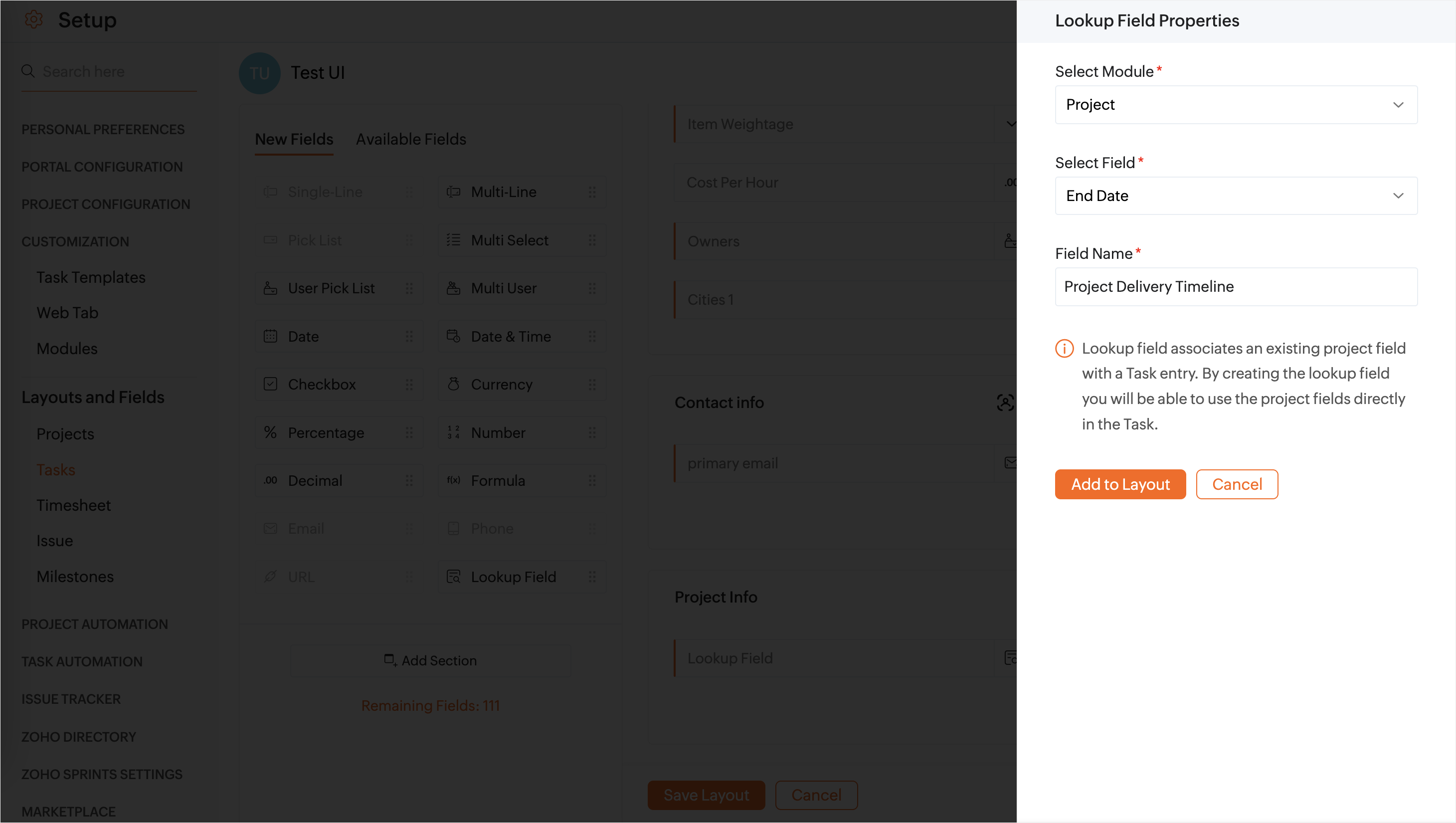 Lookup field in task layouts can be associated with other fields in the projects module. This supports default as well as custom fields in the projects module.