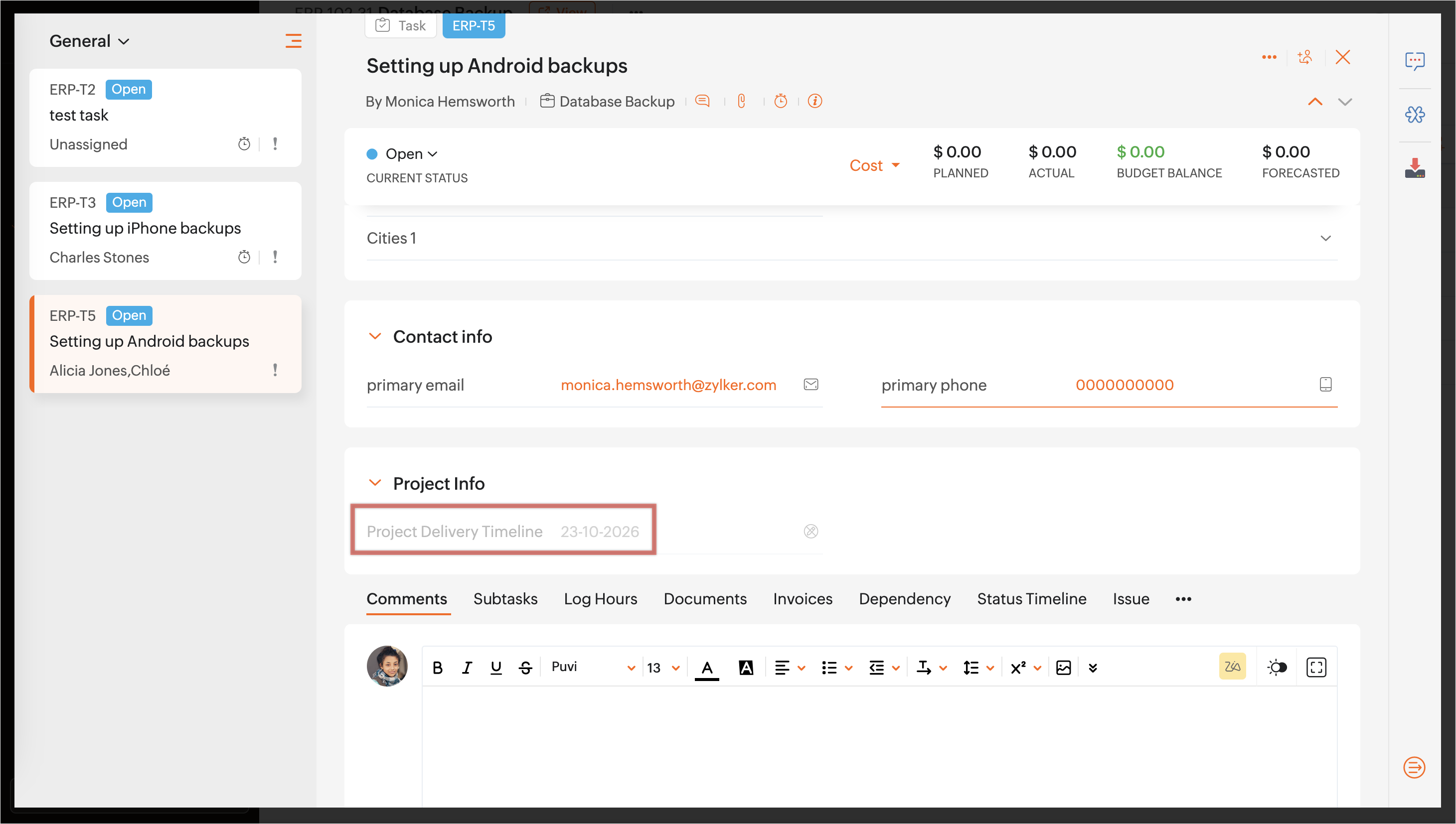 Users can keep track of project deadline while working on task by associating project due date field with a task layout using the Lookup field. This will display the project end date in the task list view and the details page.